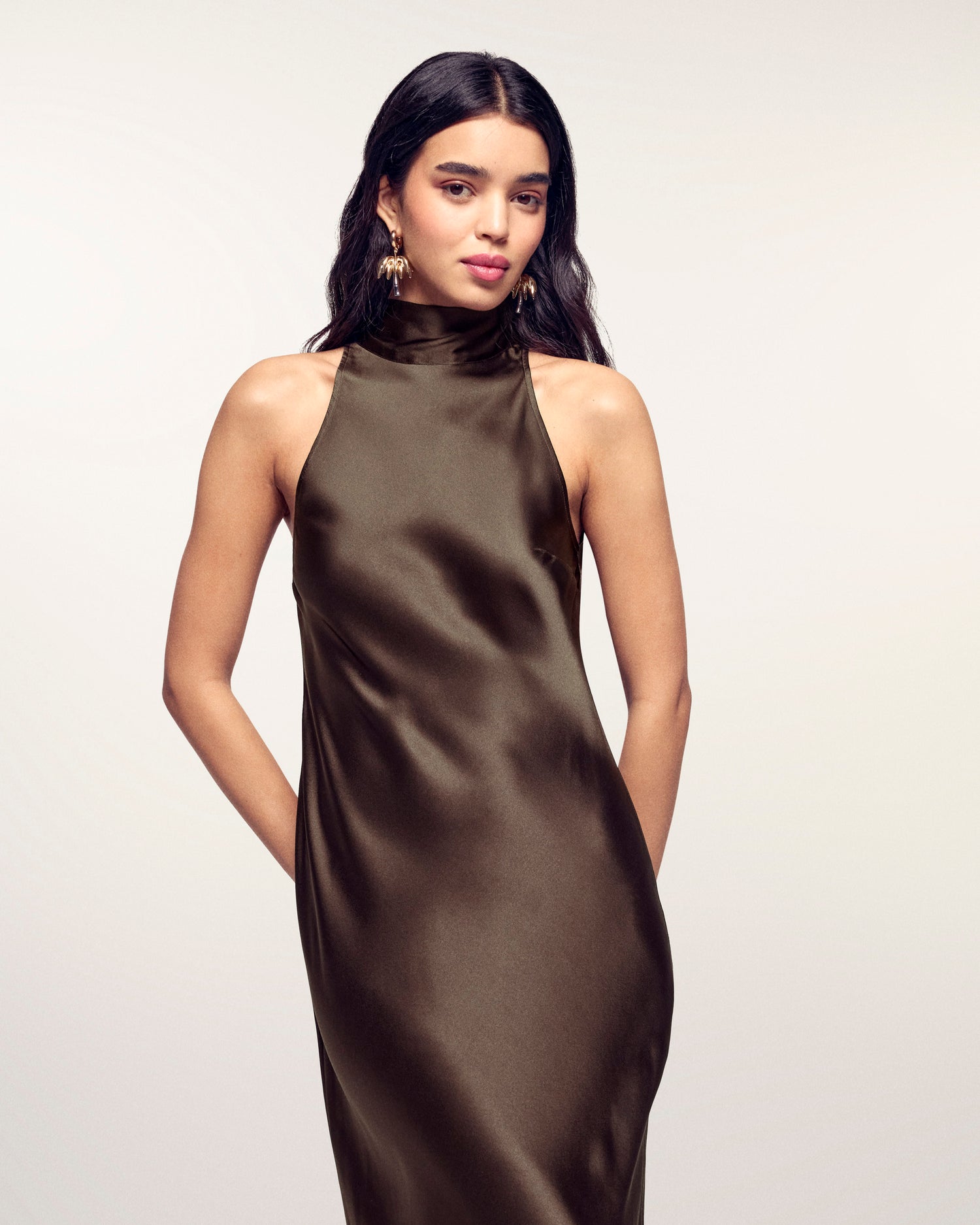 A piece of high elegance. Crafted from 100% Silk (Silk satin) for a fluid and luxurious drape, this long dress features a sophisticated scarf neck that ties around the neck. Its slim fit enhances the silhouette for an incomparable evening look.