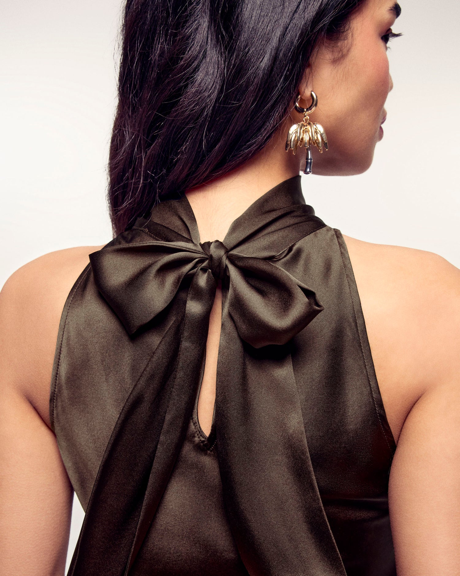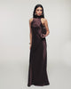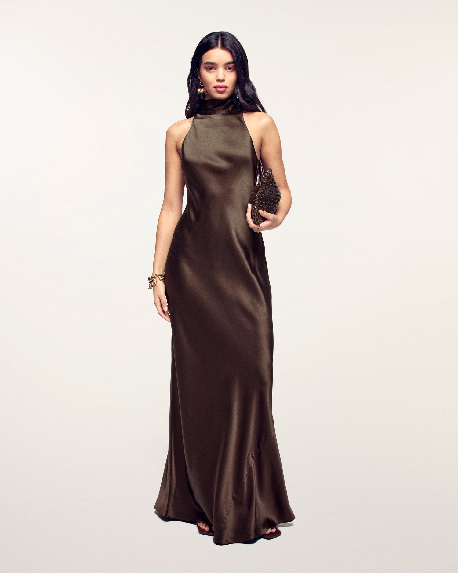 A piece of high elegance. Crafted from 100% Silk (Silk satin) for a fluid and luxurious drape, this long dress features a sophisticated scarf neck that ties around the neck. Its slim fit enhances the silhouette for an incomparable evening look.
