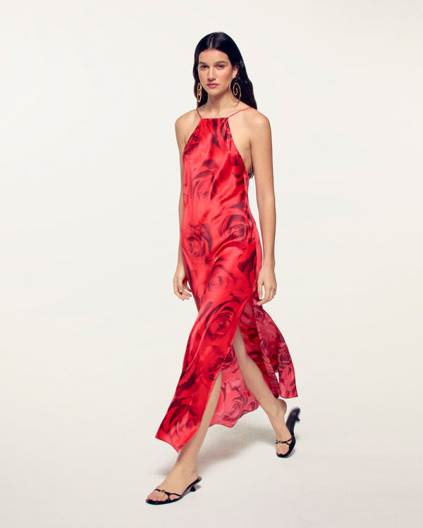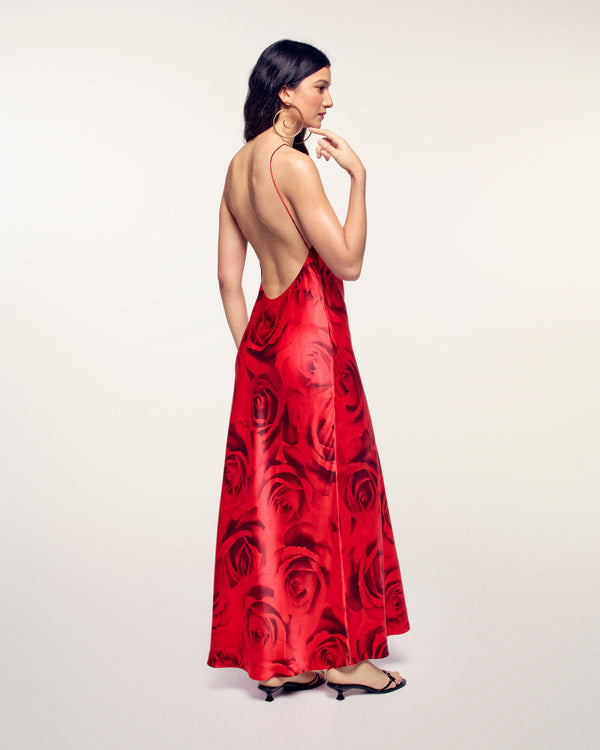 Crafted from 100% Silk for a fluid and luxurious drape, this piece is enhanced by its spectacular backless design and bold rose print. A long slim fit that guarantees a sophisticated look.