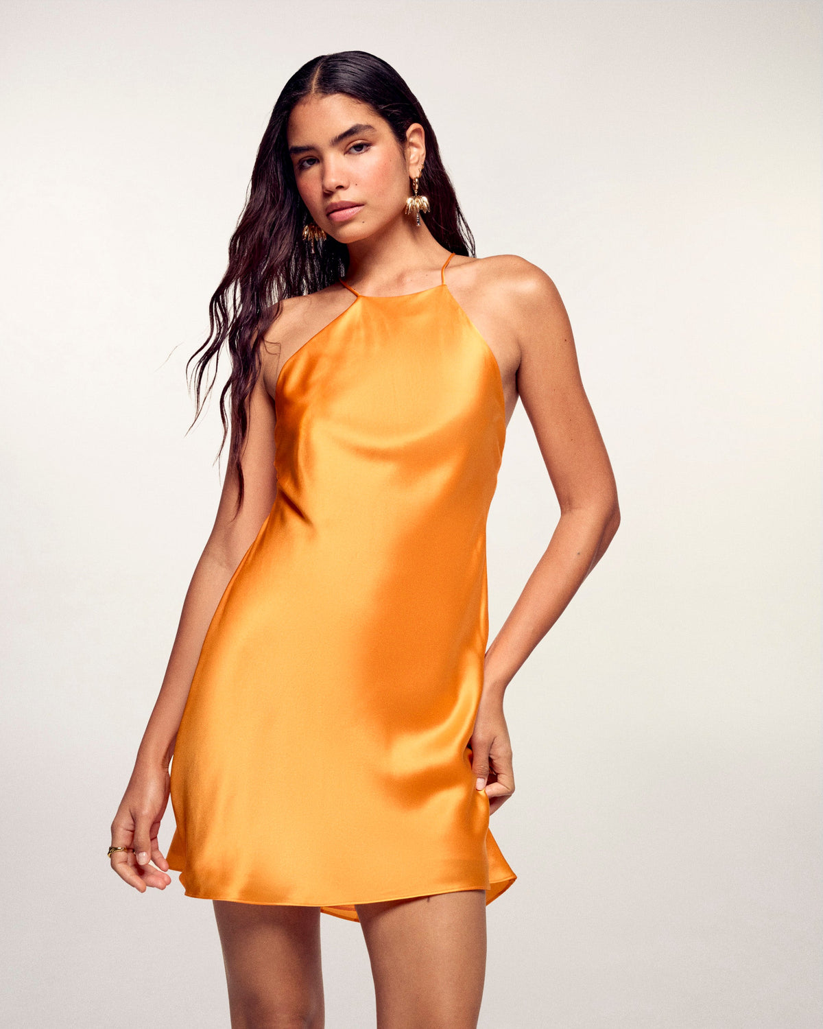 A vibrant silhouette for this silk satin short dress, a centerpiece of our collection. It is distinguished by its play of thin straps crossed in the back, offering an allure that is both delicate and sophisticated. Its noble material and fitted cut catch the light for a solar and refined look, ideal for your summer evenings.
