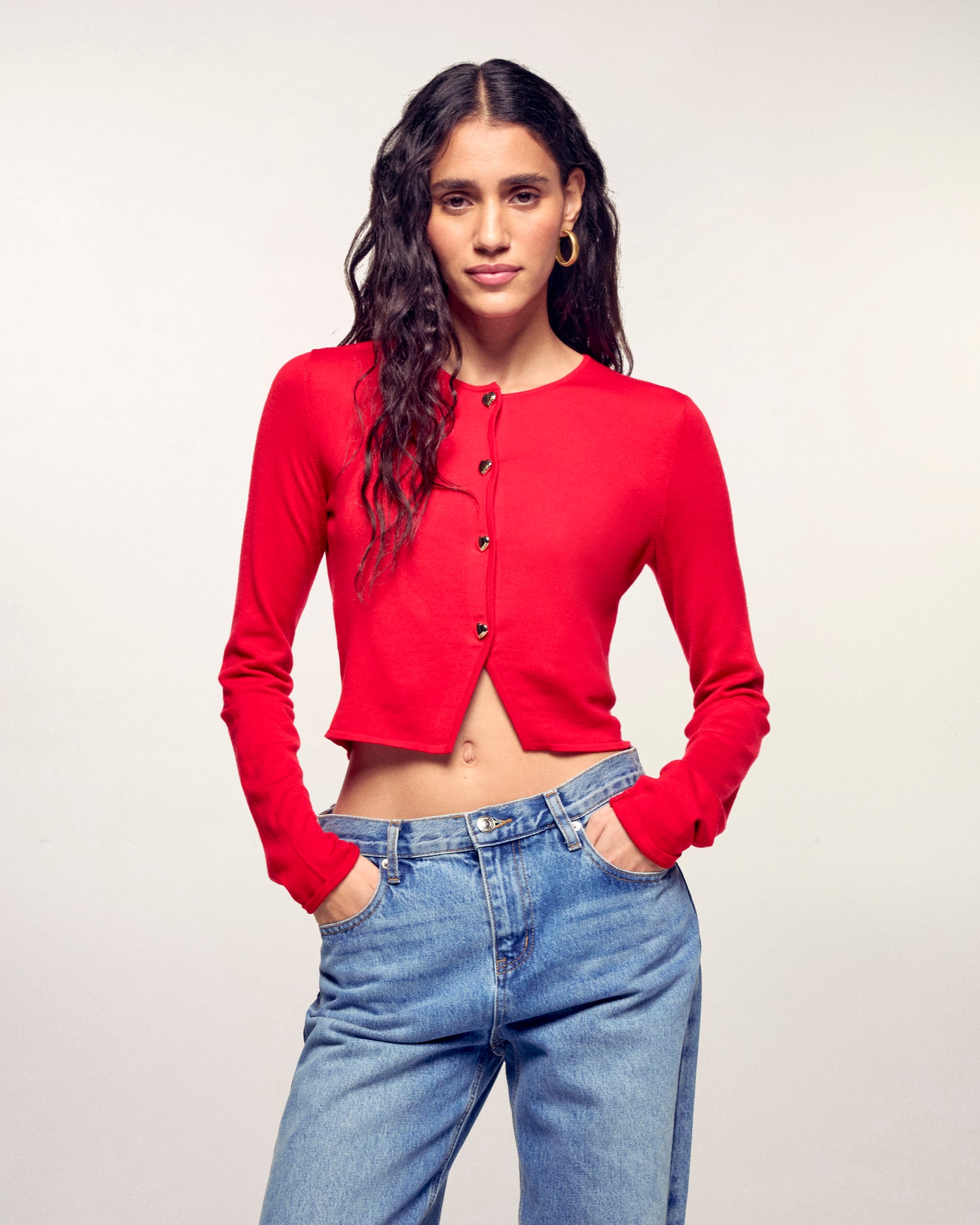 A romantic yet modern piece, ideal for completing your seasonal outfits. This merino wool cardigan stands out with its gold heart-shaped buttons, adding a feminine and precious touch to its clean silhouette.