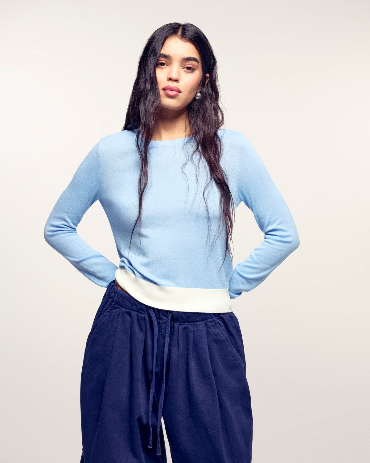 Crafted from 2-ply merino wool, this sweater features a short cut accentuated by a contrasting hem. Featuring a crewneck and long sleeves, it is effortlessly worn with casual jeans or a structured skirt.