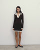 Crafted from 4-ply merino wool, this short dress is adorned with a plunging neckline and delicate ruffles. A shirt neck and contrasting edges create a sophisticated, fitted silhouette.