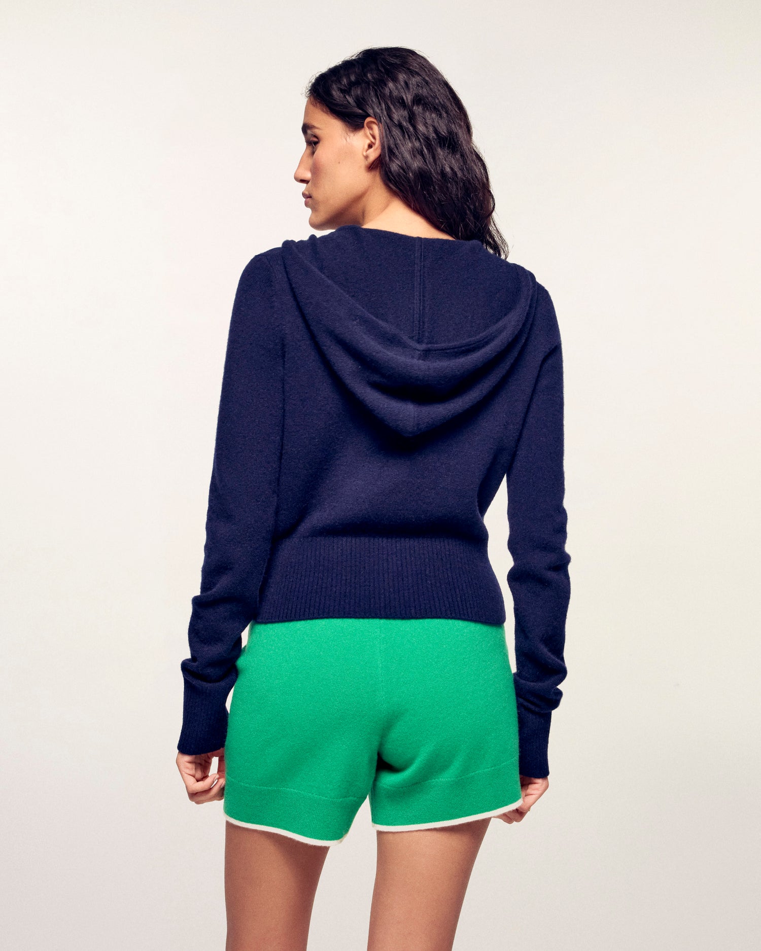 A relaxed yet luxurious silhouette that reinterprets sportswear codes with elegance. This lightweight cashmere hoodie sweater stands out with its gold-tone metal zip fastening at the center front, adding a touch of light and sophistication to an everyday essential.