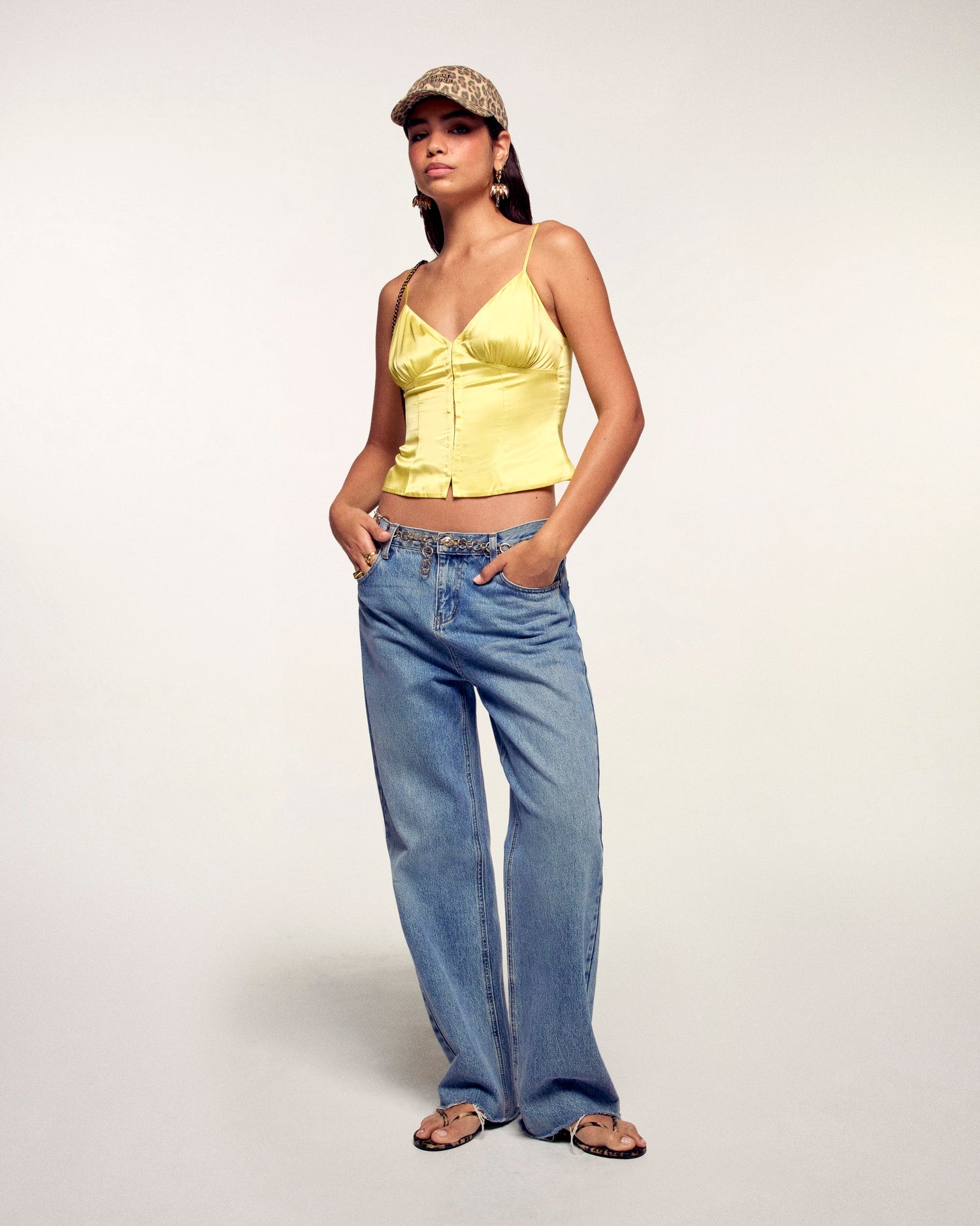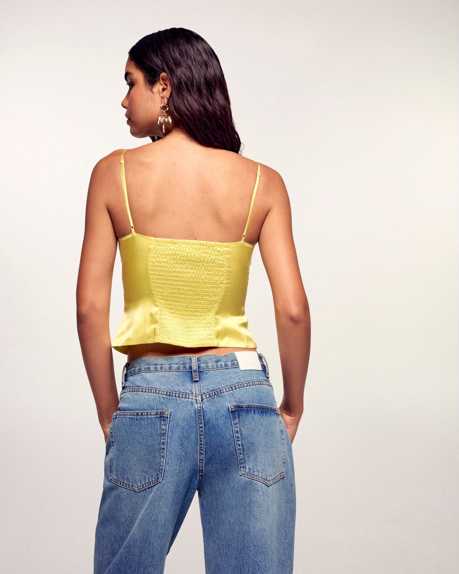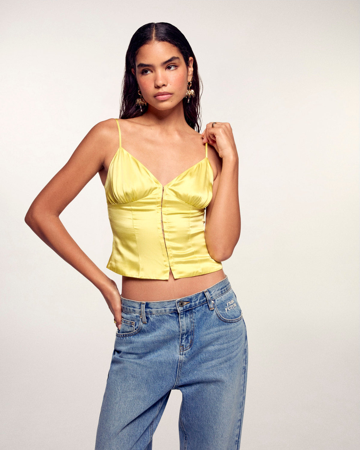 A statement piece with couture accents that elegantly structures the silhouette. This silk satin top stands out with its play of gathers on the bust and its front opening adorned with hook-and-eye closures, offering a look that is both sophisticated and resolutely modern.