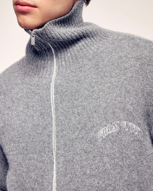 This zipped cardigan is crafted from pure cashmere, ensuring exceptional warmth and softness. Its classic cut and mock neck make it a timeless piece, enhanced by the signature "FROM FUTURE" embroidery.