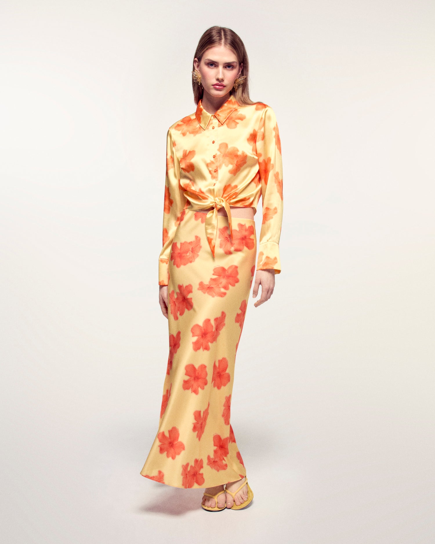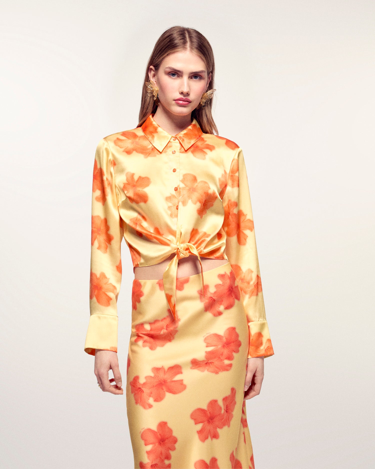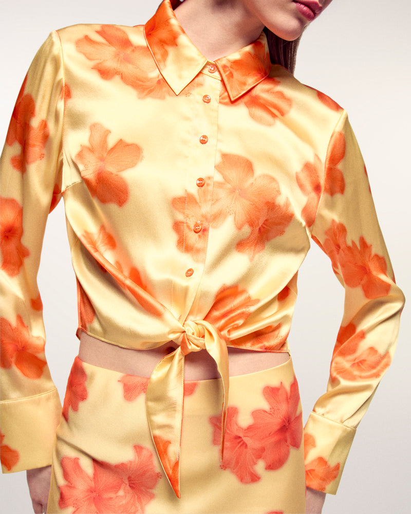 Silky fabric and a vibrant colour: this short shirt adds a fresh touch to your seasonal silhouette. Featuring a buttoned closure and long sleeves, it is tied at the front. Complete the look with a flowing skirt.