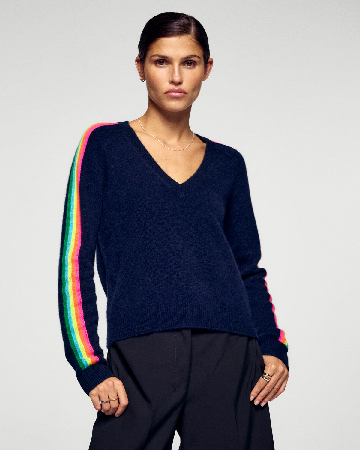Crafted from 4 ply cashmere, this short sweater features a V-neck and ribbed edges. It reveals multicolored stripes along the long sleeves, the signature of the FROM FUTURE wardrobe. Easy to mix and match, complete your look with straight-leg jeans or comfortable jogging.