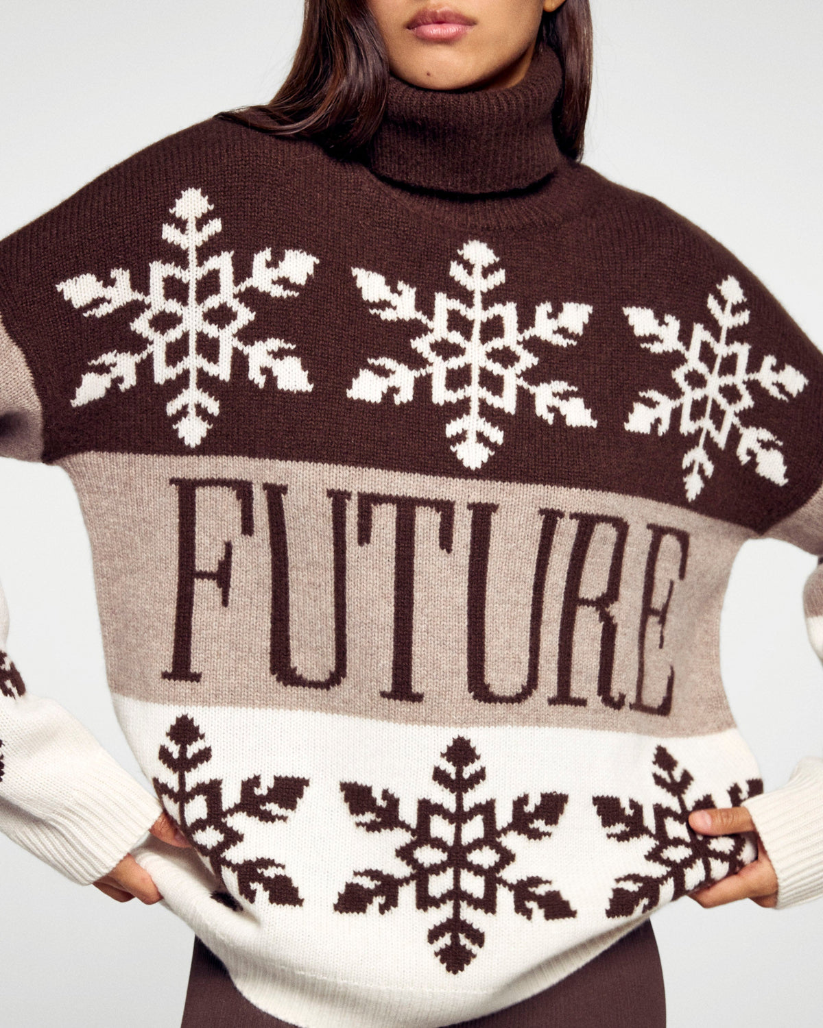 100% cashmere sweater adorned with a snowflake motif and contrasting “Future” lettering. Its relaxed fit and cozy turtleneck provide warmth and comfort.