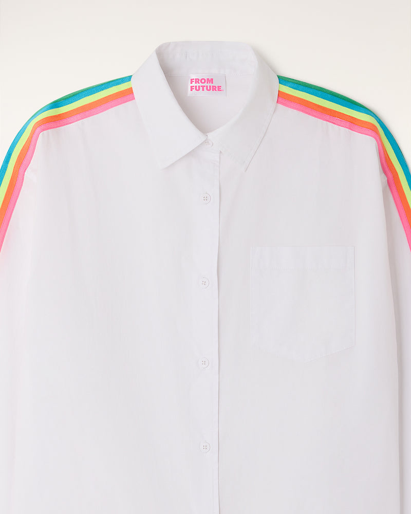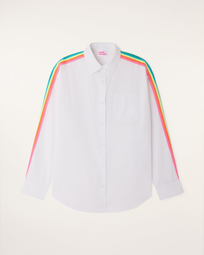 A bright and dynamic piece that revisits the codes of the classic shirt. Made from cotton poplin, it stands out with its multicolored stripes placed along the sleeves for a graphic and modern look. Its oversize fit offers an impeccable drape and absolute everyday comfort.