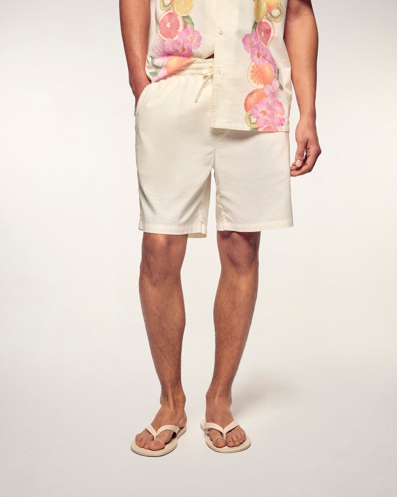 An essential of the summer wardrobe, these shorts focus on absolute comfort and a casual style. Crafted from a light blend of linen and cotton, they feature a regular fit with an elasticated waist and a drawstring for an ideal adjustment. They stand out with our "Future" signature delicately embroidered in satin stitch on the side, bringing a polished finish to this essential piece.