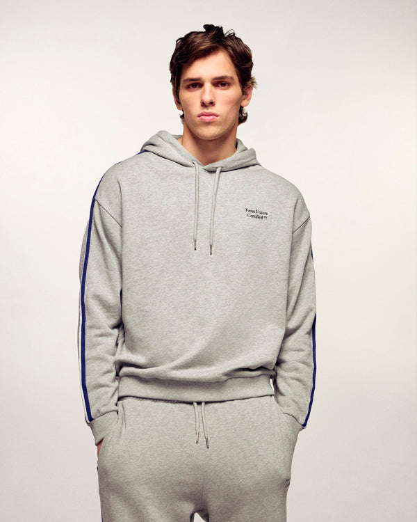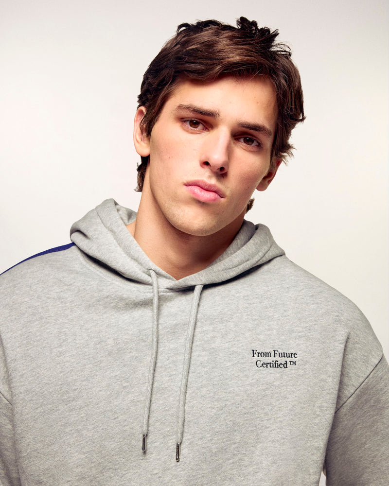 Combining absolute comfort and urban aesthetics, this cotton hoodie stands out as a key piece of the casual wardrobe. It features two-tone side stripes along the sleeves and signature "From Future Certified" embroidery in satin stitch, offering a dynamic and modern silhouette.