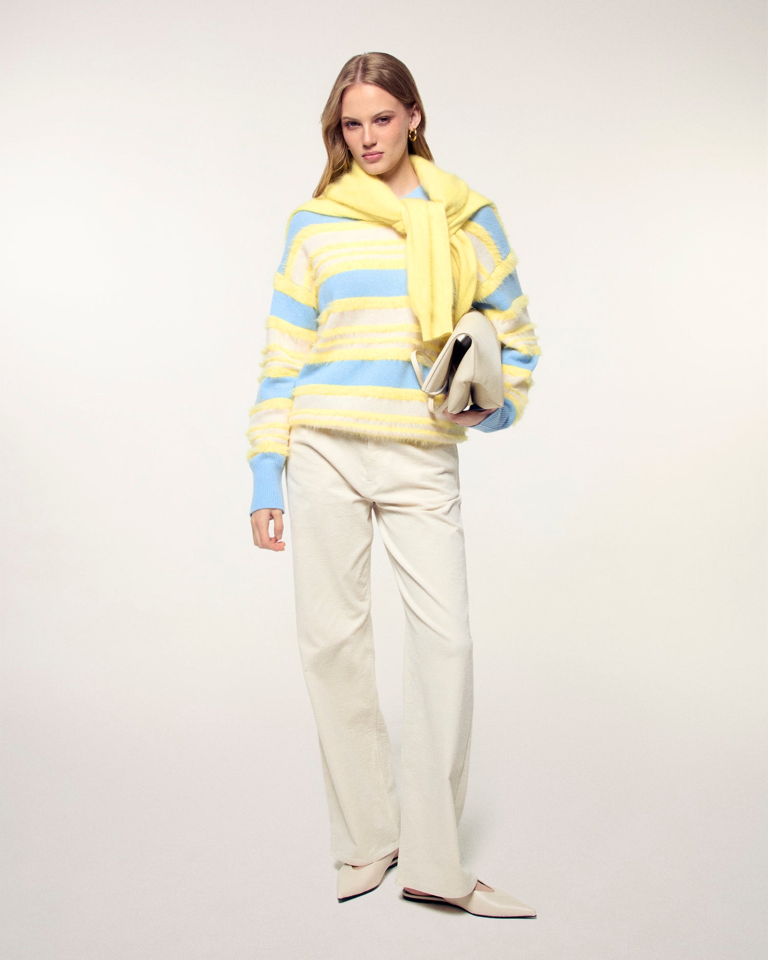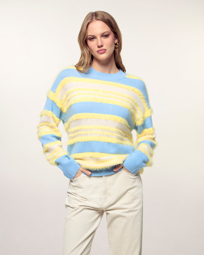 A vibrant striped sweater with bold colors, fluffy brushed texture, and a cozy, enveloping volume.