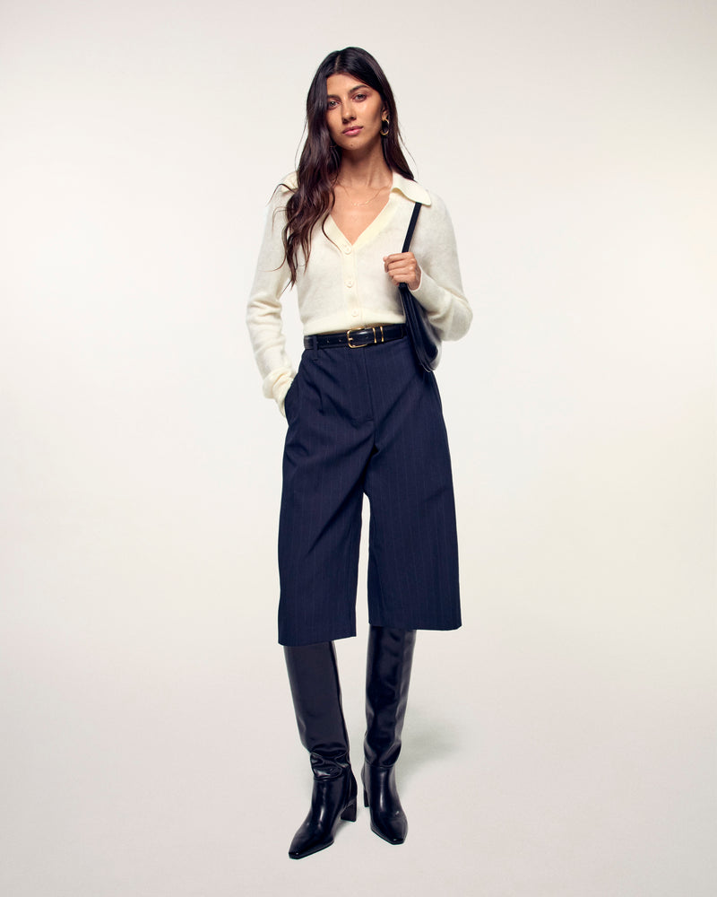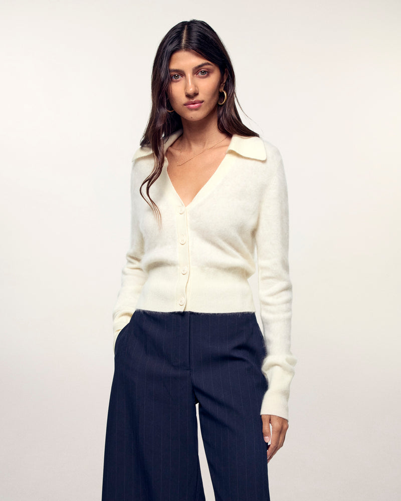A modern cashmere cardigan, enhanced by its brushed cashmere texture and ribbed trim.