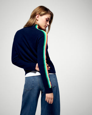 Crafted from soft and lightweight cashmere, this short sweater reveals vibrant colored bands along the sleeves. Featuring a mock neck and ribbed edges, it pairs easily with loose jeans or a flowing skirt.