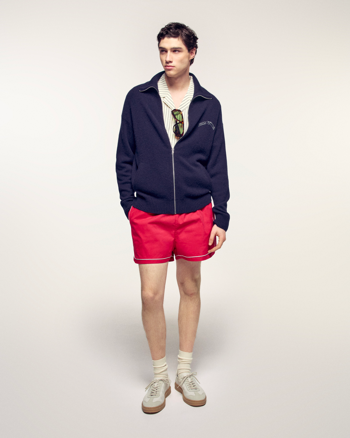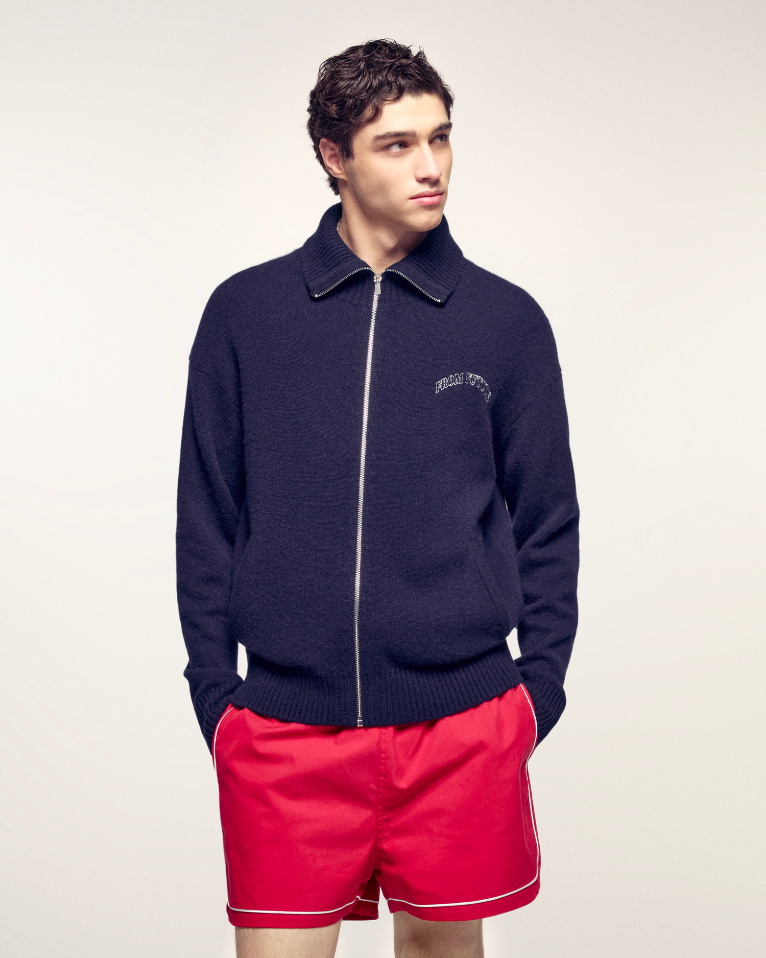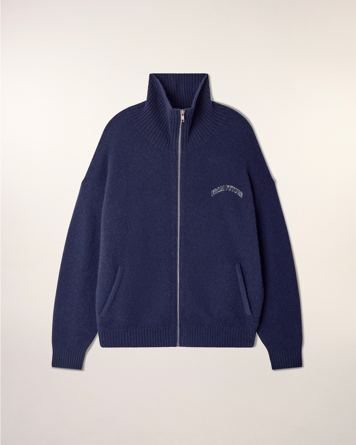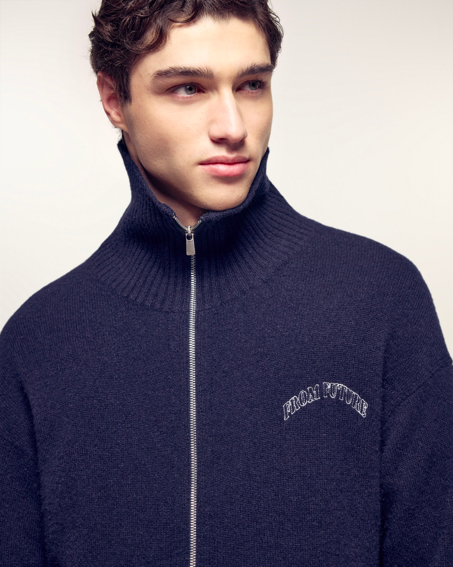 This zipped cardigan is crafted from pure cashmere, ensuring exceptional warmth and softness. Its classic cut and mock neck make it a timeless piece, enhanced by the signature "FROM FUTURE" embroidery.