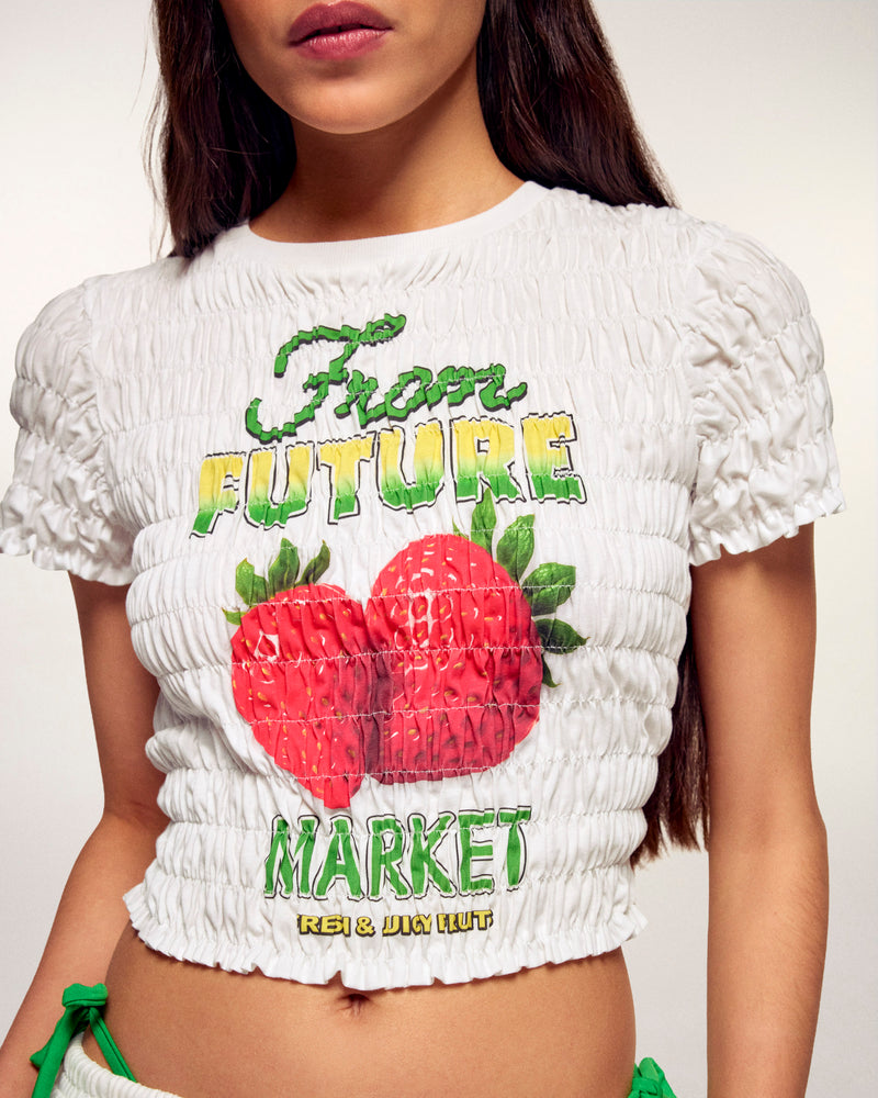 This short t-shirt revisits streetwear codes with an original texture. Entirely crafted with smocking, it offers a slim and stretchy fit that perfectly hugs your curves. It stands out with its "FROM FUTURE MARKET" graphic accompanied by a strawberry visual on the front, bringing a playful and colorful touch to your outfit.
