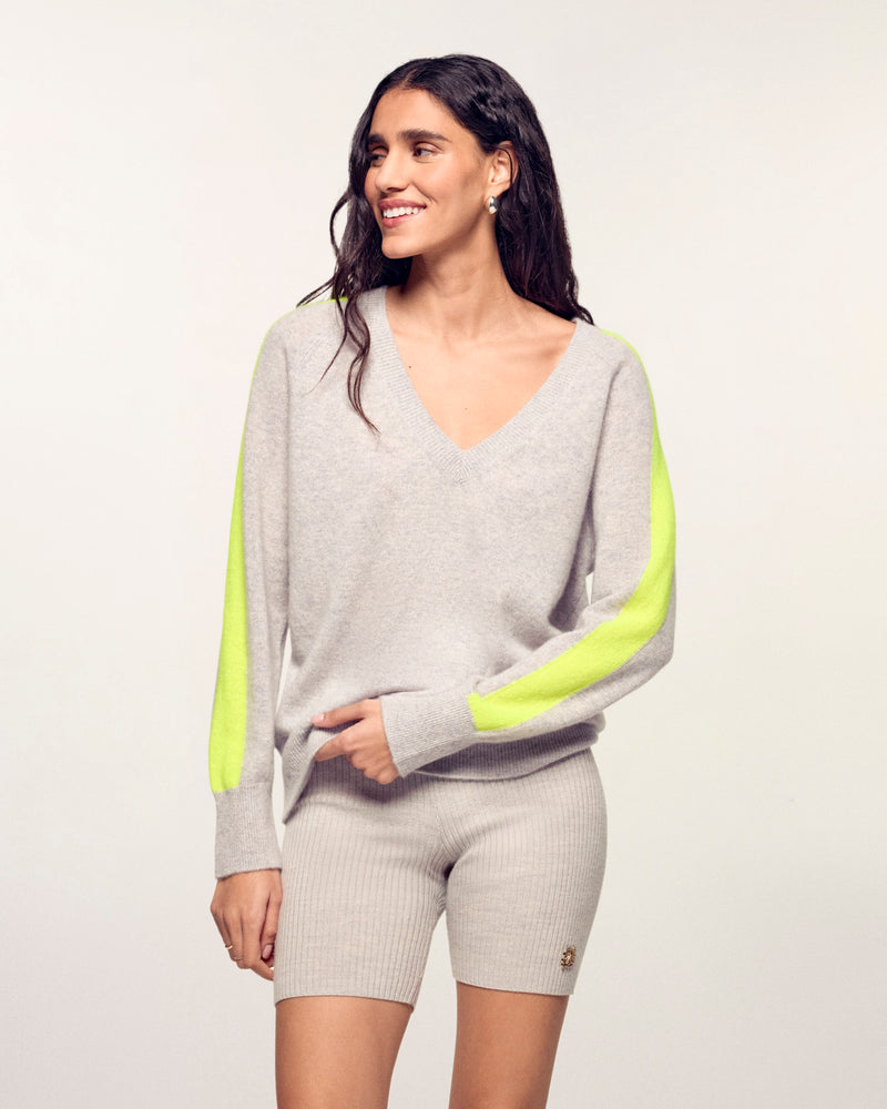 Crafted from 2-ply lightweight cashmere, this cropped, oversized sweater features ribbed edges and a V-neck. Adorned with vibrant colors, it reveals two-tone bands along the sleeves. Complete your casual and elegant silhouette with a satin skirt or casual jeans.