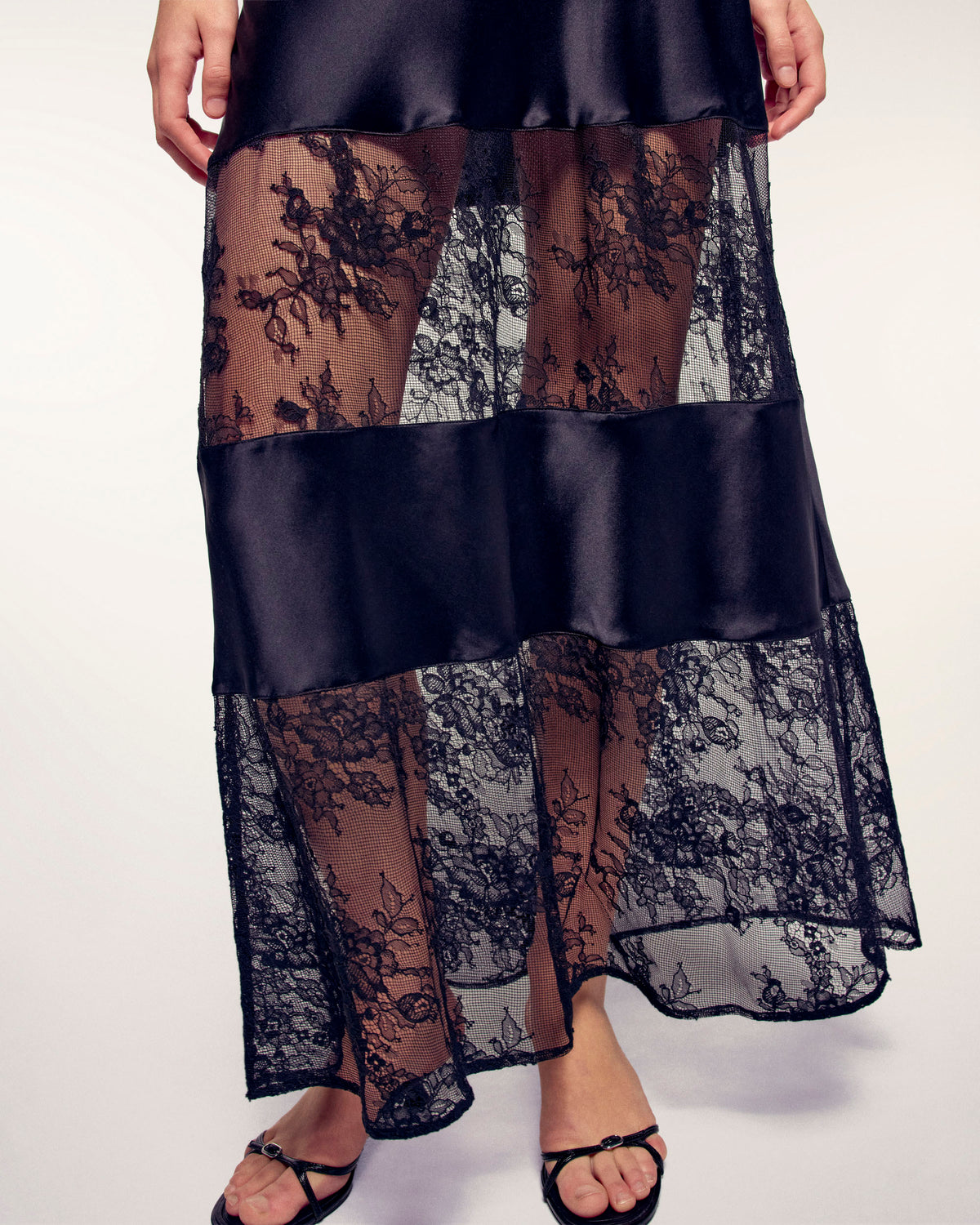 Crafted from 100% Silk for a fluid drape, this piece features a long and slim fit. Its design is boldly structured by wide lace chevrons, providing texture and sophistication.