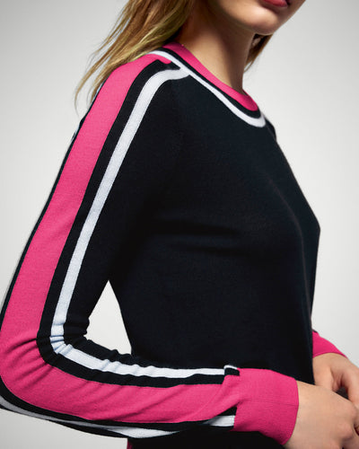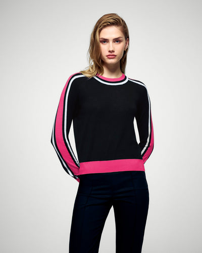 This soft and lightweight sweater is crafted from 100% merino wool certified RWS (Responsible Wool Standard). The classic crew neck and long sleeves are adorned with contrasting edges and bicolor bands, adding a bold twist to your look.