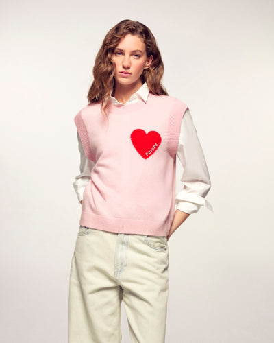 Blending lightness and softness, this cropped and oversize sleeveless sweater in 100% cashmere features a crewneck. The signature detail? A red heart intarsia embroidered with “FUTURE” on the chest. Wear it on its own or layered over a shirt for a sophisticated look.