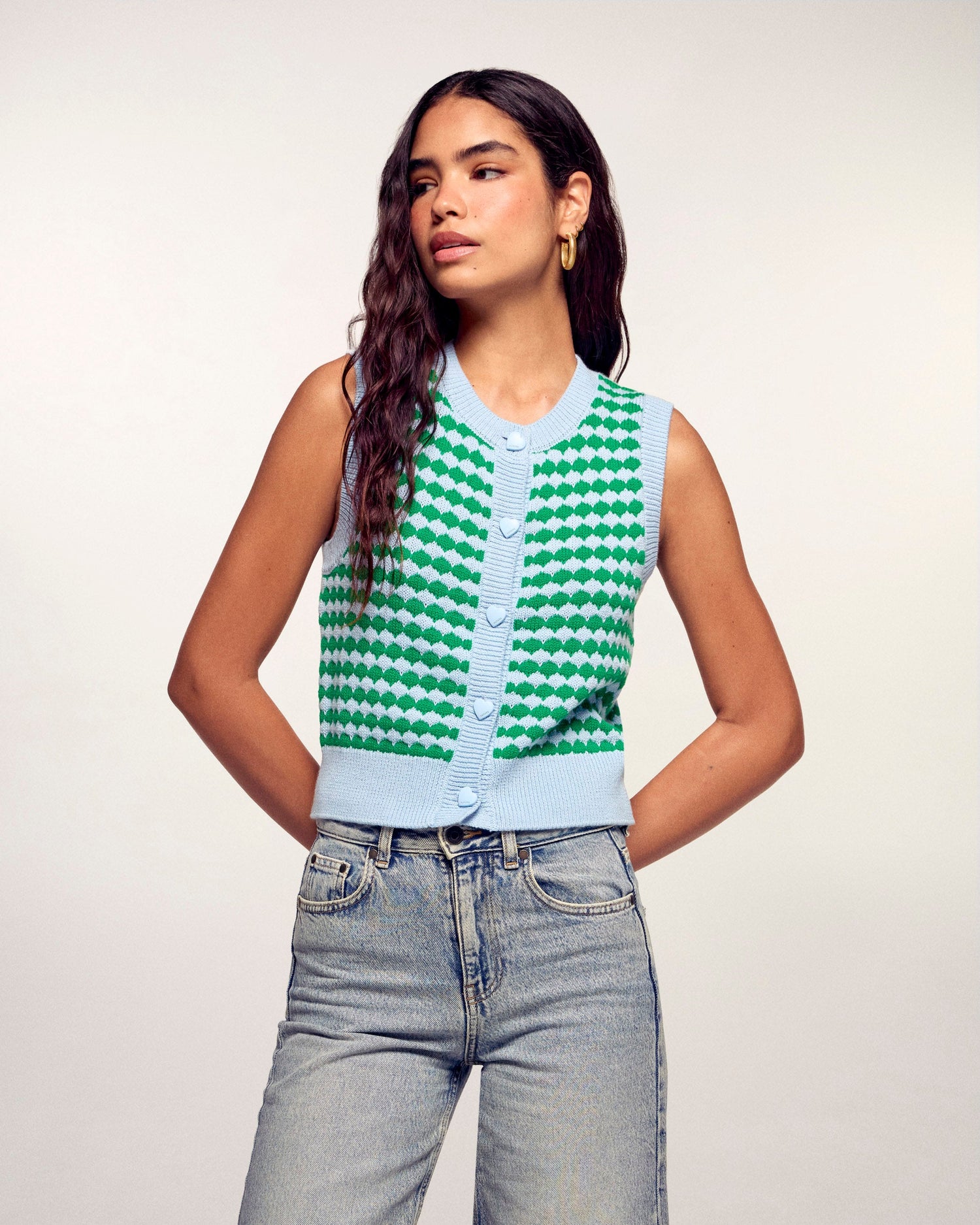 The sleeveless cardigan offers a playful and graphic look for the new season. Crafted from a soft blend of cotton and cashmere, it stands out with its textured two-tone stitch play and adorable heart-shaped buttons. Its regular and cropped fit makes it the ideal layering piece for a modern silhouette full of pep.