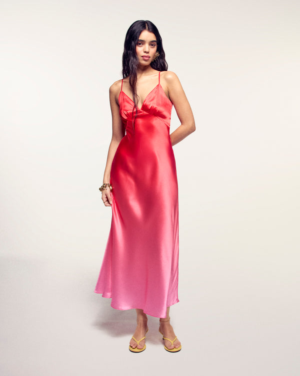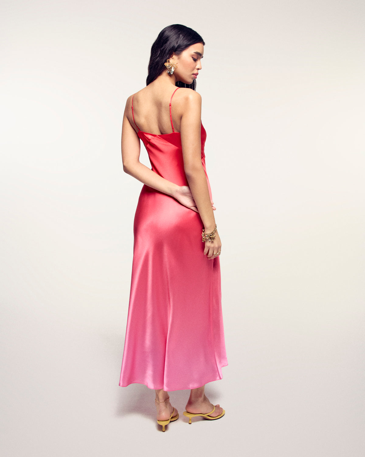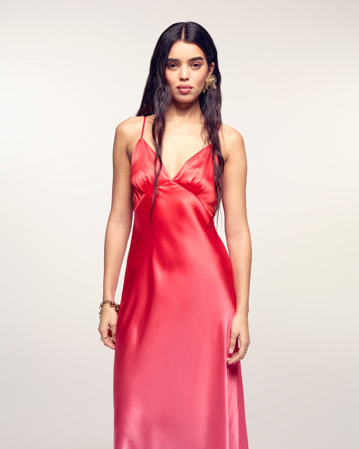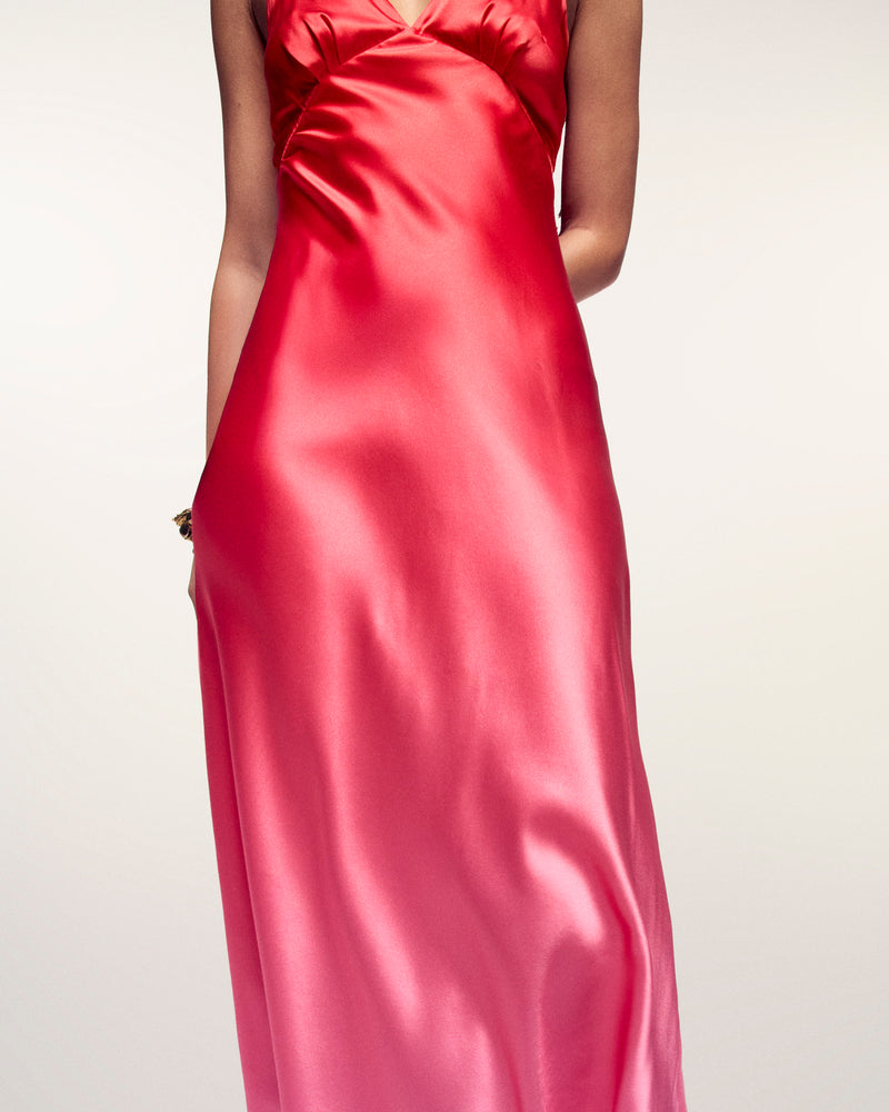 Solar elegance enters your wardrobe with this silk satin maxi dress. Its blurred print and slim fit create an alluring silhouette, completed by a V-neckline and thin adjustable straps. A fluid and flared model, ideal for a sophisticated yet light look.