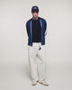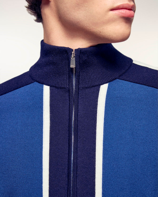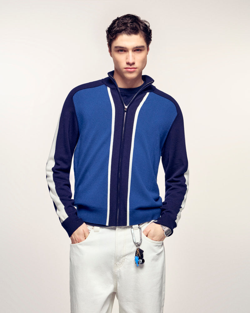 This two-tone cardigan, inspired by chic sportswear, is crafted from pure extra-fine merino wool. Its structured tricolor knit and contrasting stripes on the sleeves make it a strong and timeless piece.