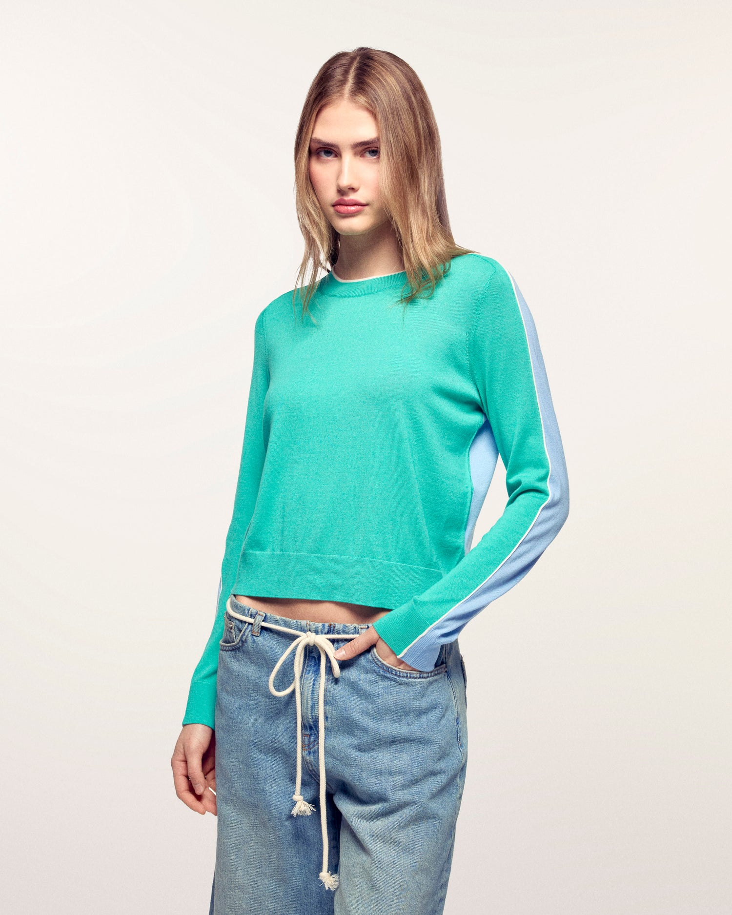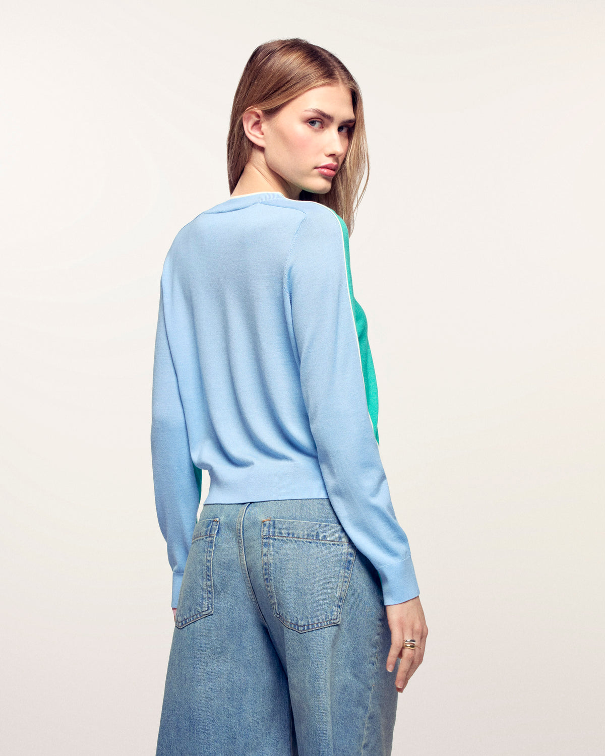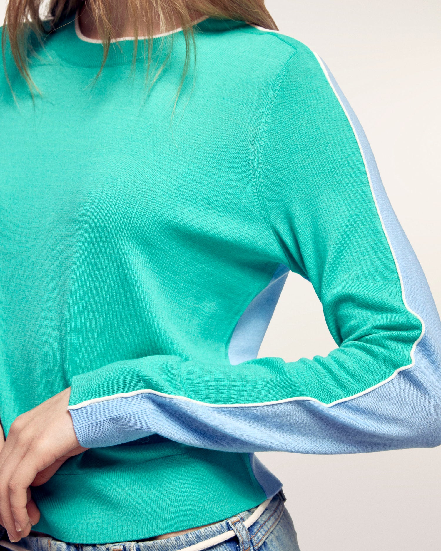 The ultra-vibrant color-block sweater. Crafted from 2-ply Extrafine Merino Wool, this sweater offers a soft and light knit. Its regular fit and tricolor construction are enhanced by contrasting stripes on the sleeves and collar in a third color, creating a sporty-chic graphic effect.