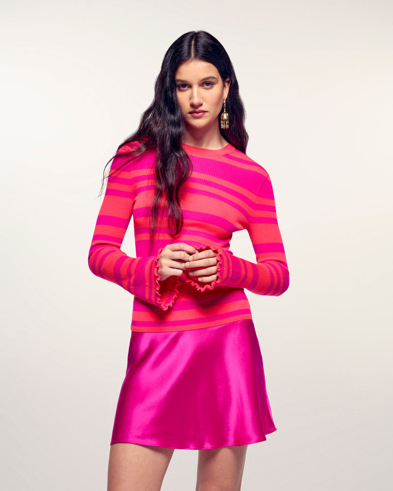 The top that dares to be colorful. Crafted from 100% Extrafine Merino Wool, it features a flattering slim fit and ultra-soft ribbed knit. Its vibrant two-tone stripes and flared sleeves offer a bold and modern look.