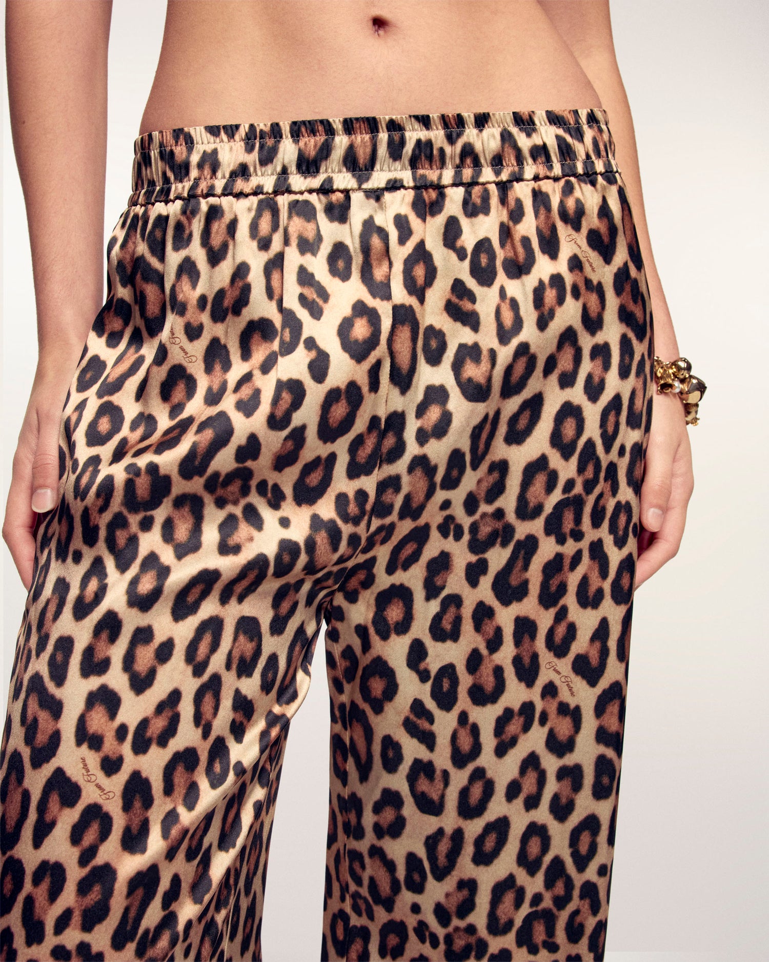 Crafted from shiny satin silk, these wide-leg pants features a bold leopard print. The elasticated waist ensure a flattering fit and a flowing silhouette.