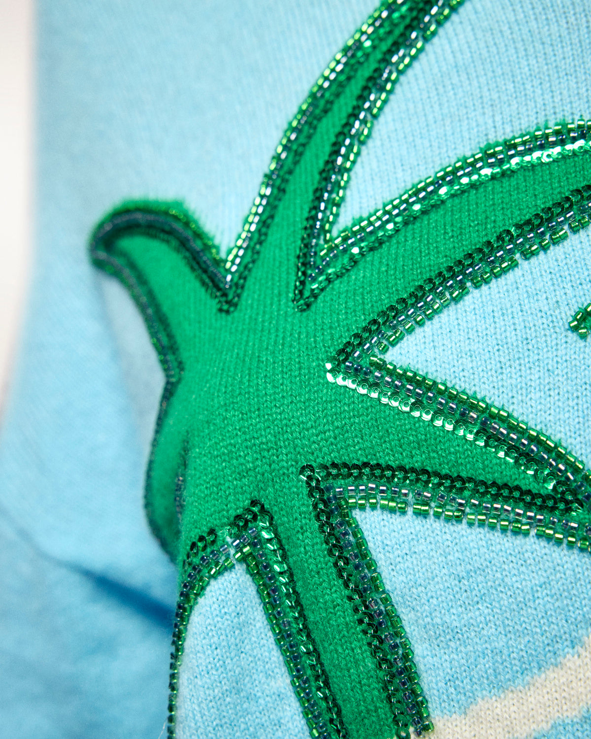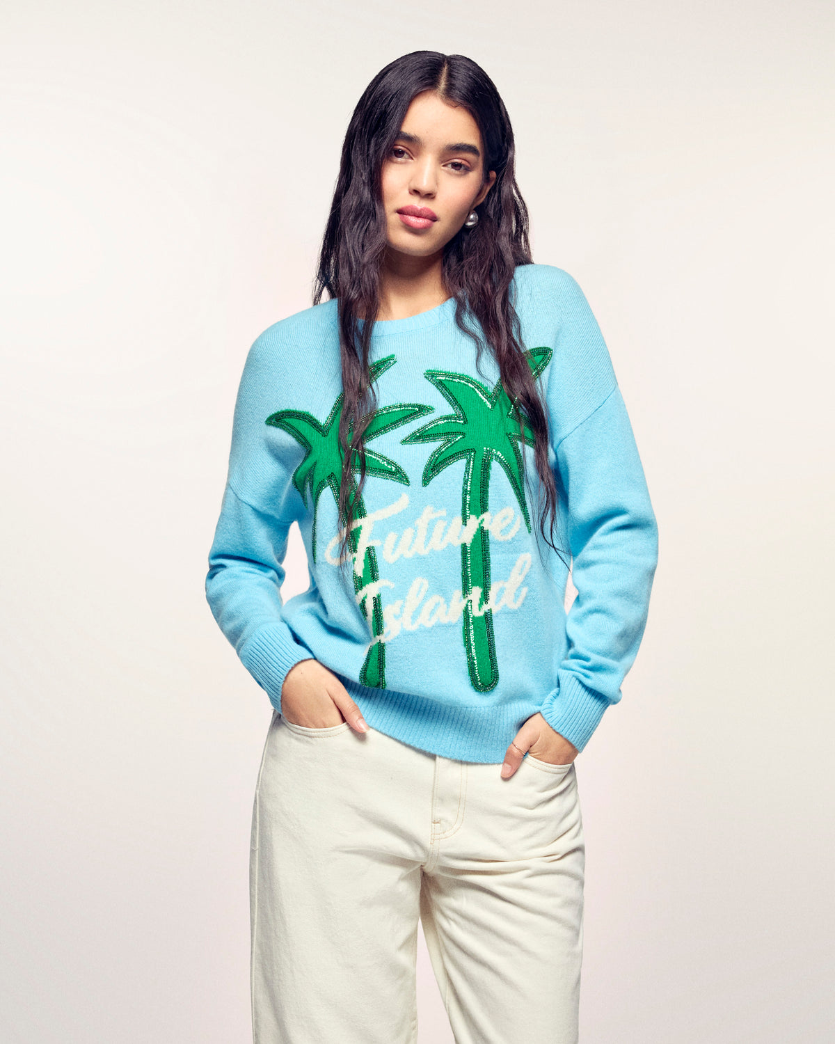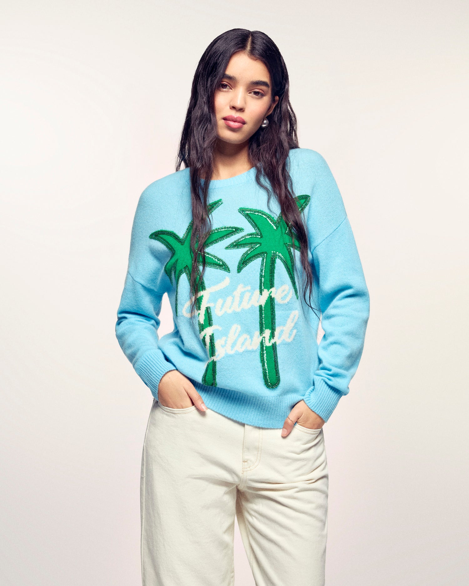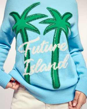 An invitation to travel with a touch of sparkle. Crafted from 2-ply Cashmere, this crewneck sweater offers a soft and light knit. Its timeless regular fit is boosted by a large "Future Island" palm tree jacquard motif, whose outlines are finely enhanced by bugle bead and sequin embroidery for a shimmering effect.
