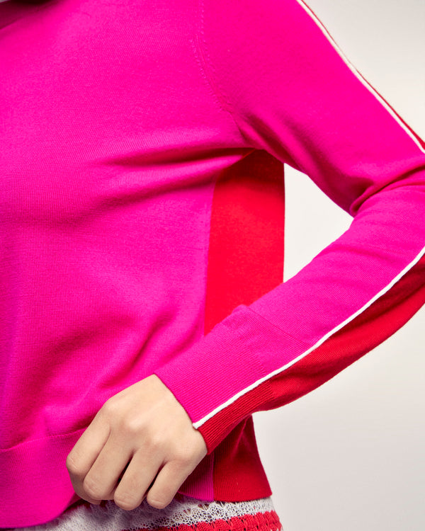 The ultra-vibrant color-block sweater. Crafted from 2-ply Extrafine Merino Wool, this sweater offers a soft and light knit. Its regular fit and tricolor construction are enhanced by contrasting stripes on the sleeves and collar in a third color, creating a sporty-chic graphic effect.