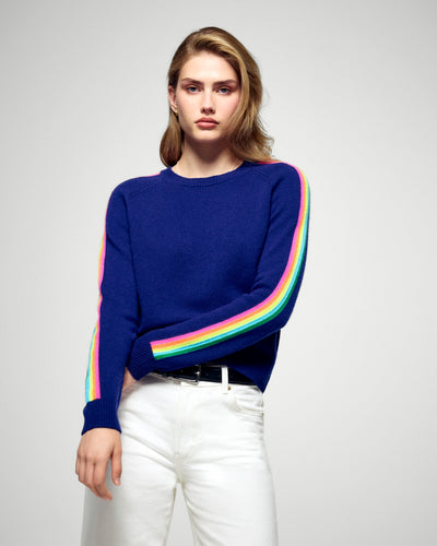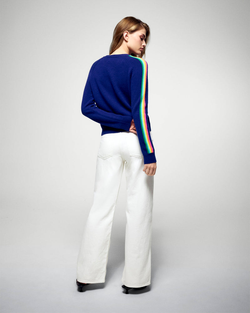Crafted from cashmere, this cropped sweater features a crew neck and ribbed edges for a touch of warmth and style. Bold, multicolored stripes run along the sleeves, a signature From Future detail. Pair it with wide-leg pants or a structured skirt for a versatile look.
