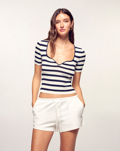 A graphic piece with a bold character that revisits the nautical spirit with a modern touch. This short sleeve top stands out with its two-tone stripes and its V-neckline subtly defined by ribbed detailing. A contrasting embroidery adds a discreet and elegant signature at the hem.