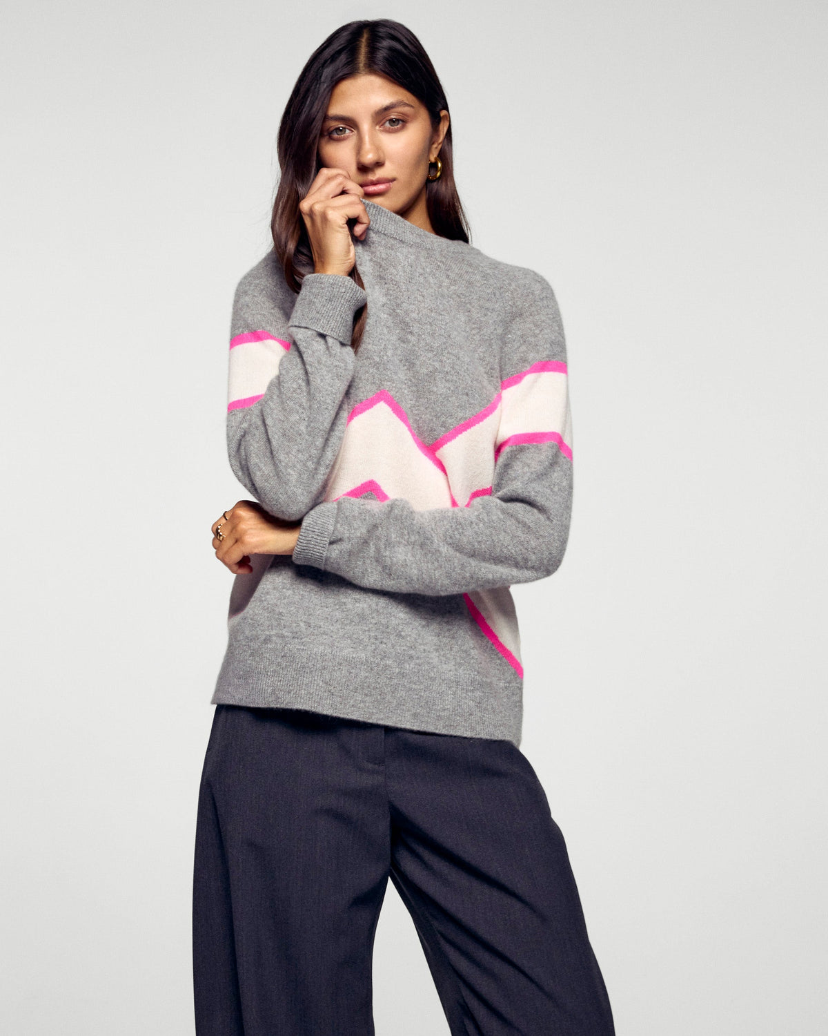 100% cashmere sweater featuring a bold, graphic contrast design on the chest and sleeves. Its oversized fit and slightly loose crew neck add comfort and modern appeal.