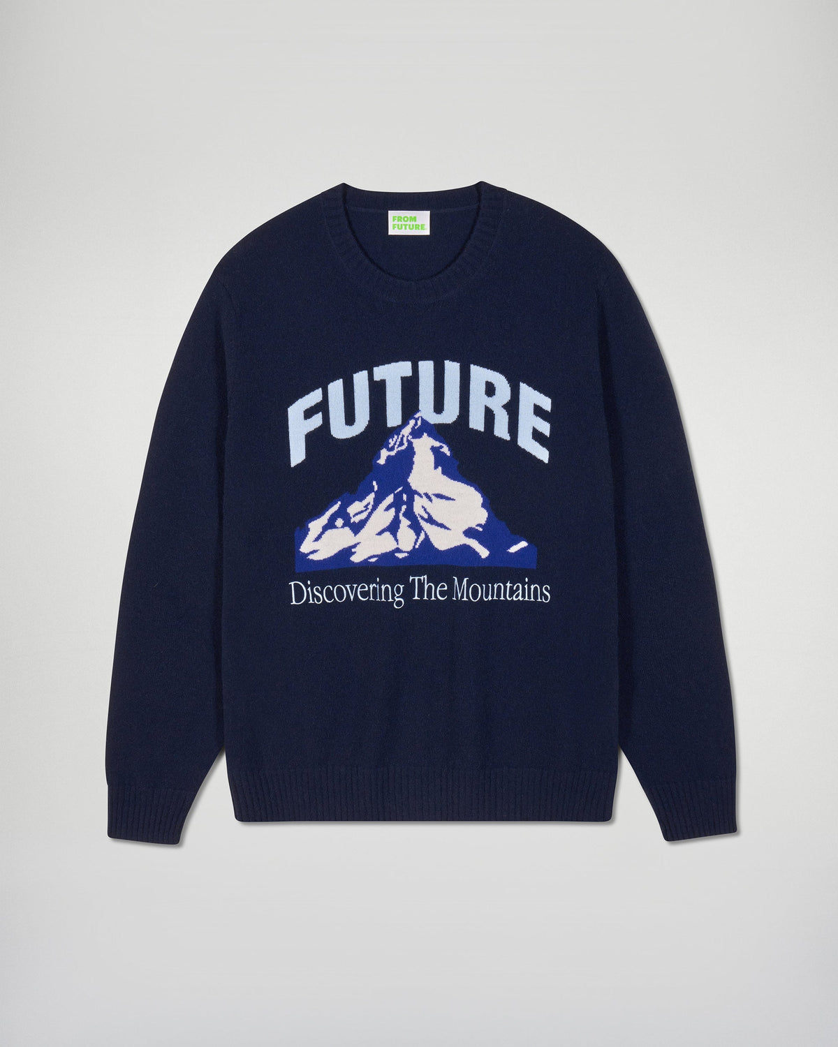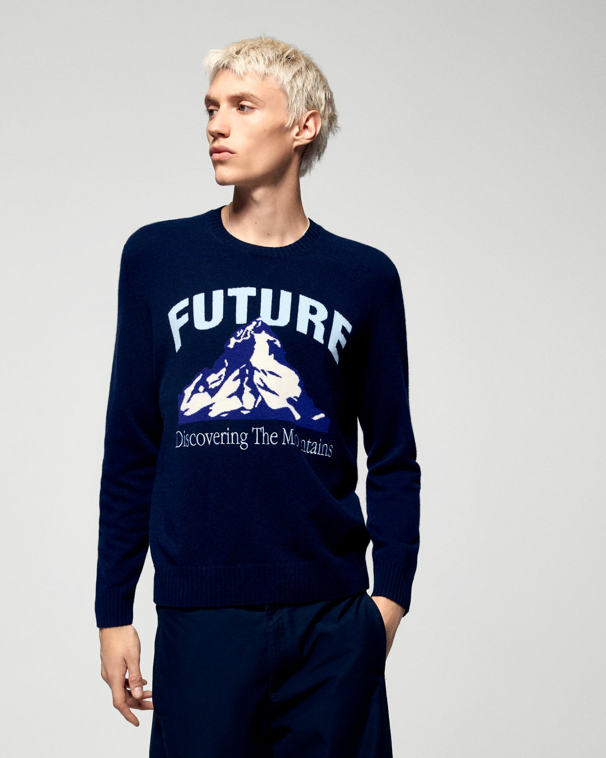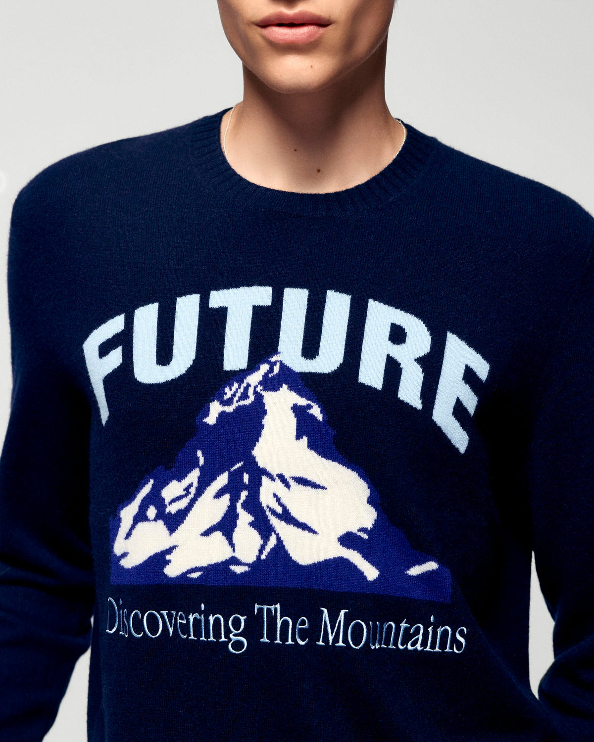 Crew Neck Sweater Discovering the Mountains - 100% Cashmere - GCS Verified  - Navy