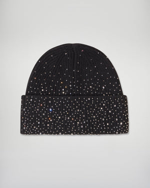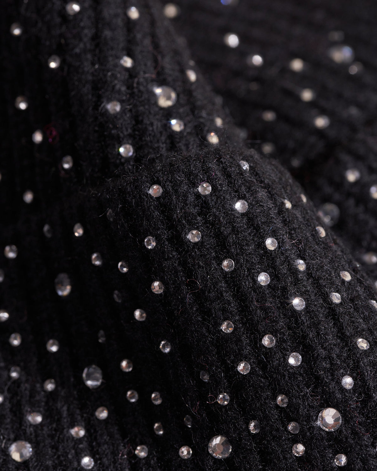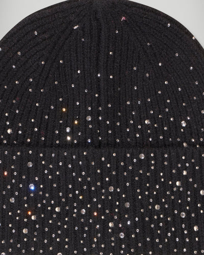 Rhinestone Ribbed Cuff Beanie - 100% Cashmere - GCS Verified - Black
