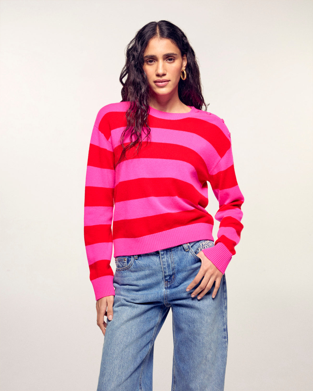 A romantic and graphic piece, ideal for brightening your seasonal wardrobe. This sweater stands out with its vibrant two-tone horizontal stripes and gold heart-shaped buttons on the shoulder, creating a look that is both soft and bold.