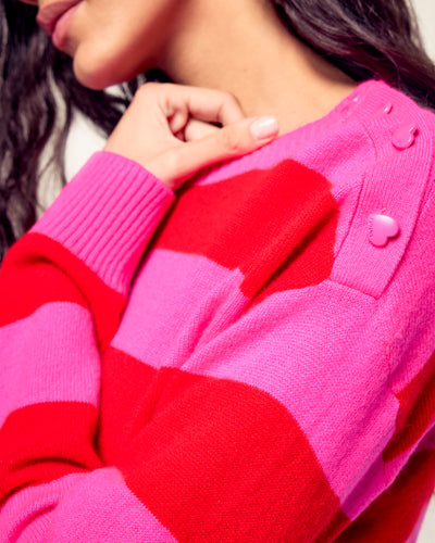 Two-Tone Striped Heart Button Crewneck Sweater - 100% Cashmere - GCS Verified - Flash Pink