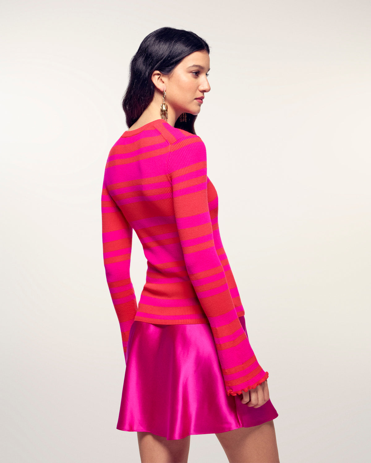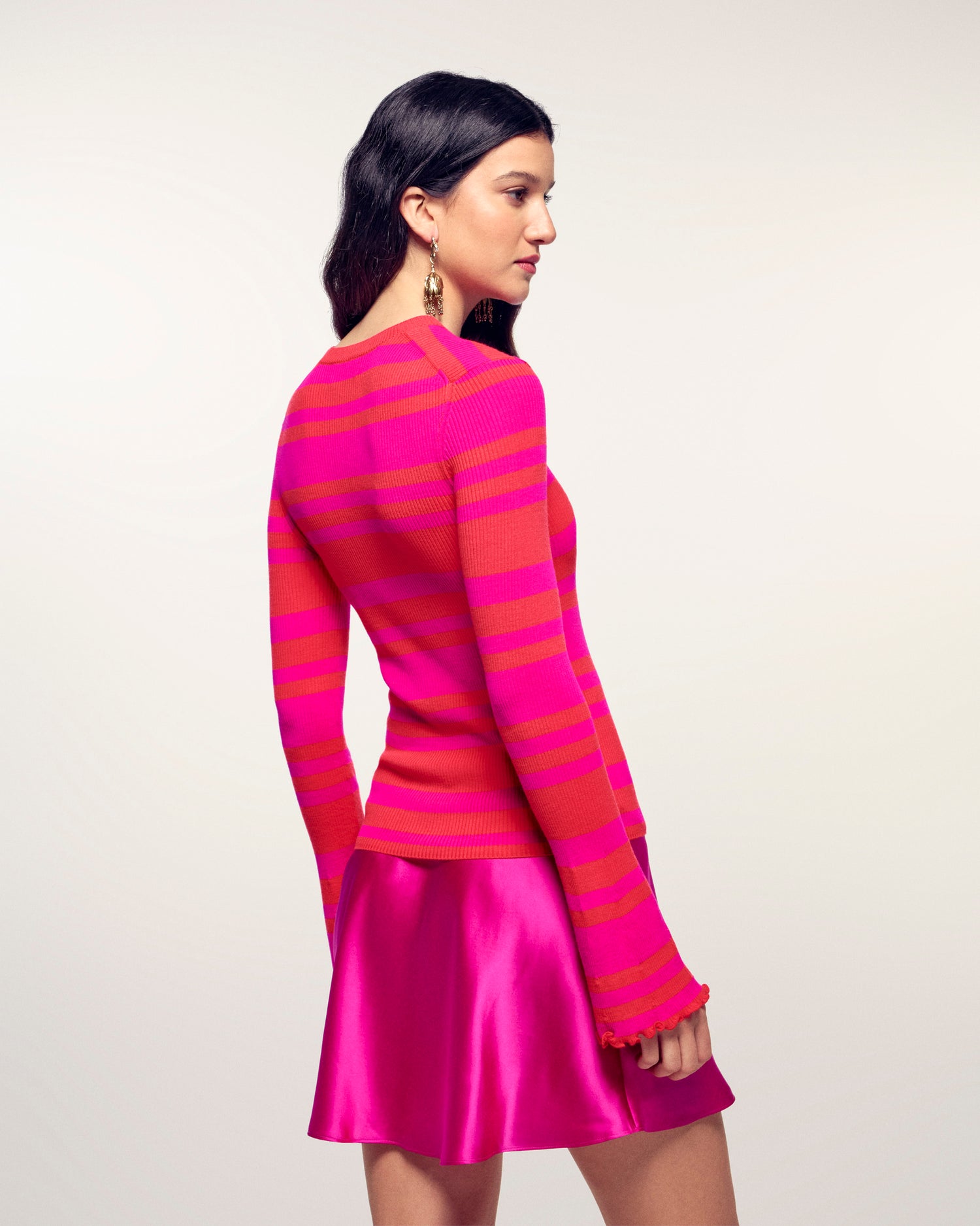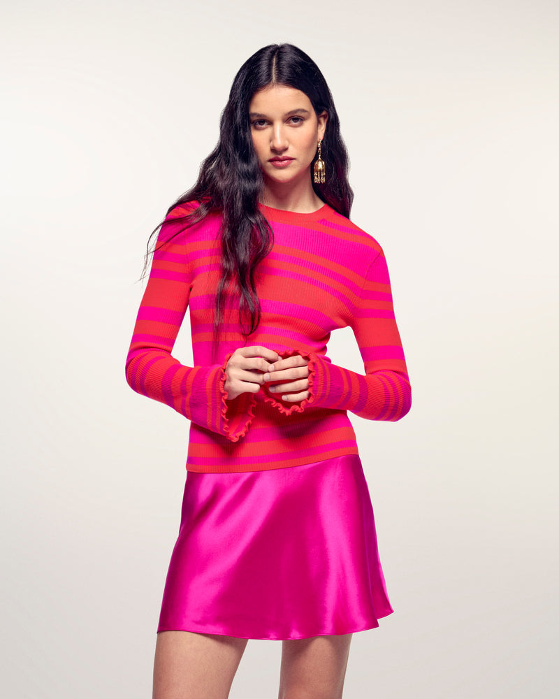 The top that dares to be colorful. Crafted from 100% Extrafine Merino Wool, it features a flattering slim fit and ultra-soft ribbed knit. Its vibrant two-tone stripes and flared sleeves offer a bold and modern look.