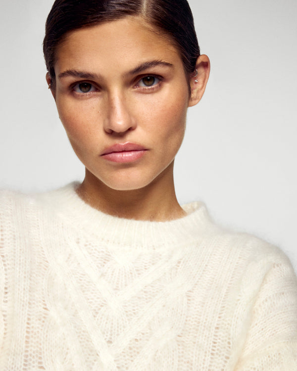 100% cashmere sweater with a soft, airy feel, crafted in a cable knit. Its oversized cut and fluid volume create an enveloping, elegant silhouette.