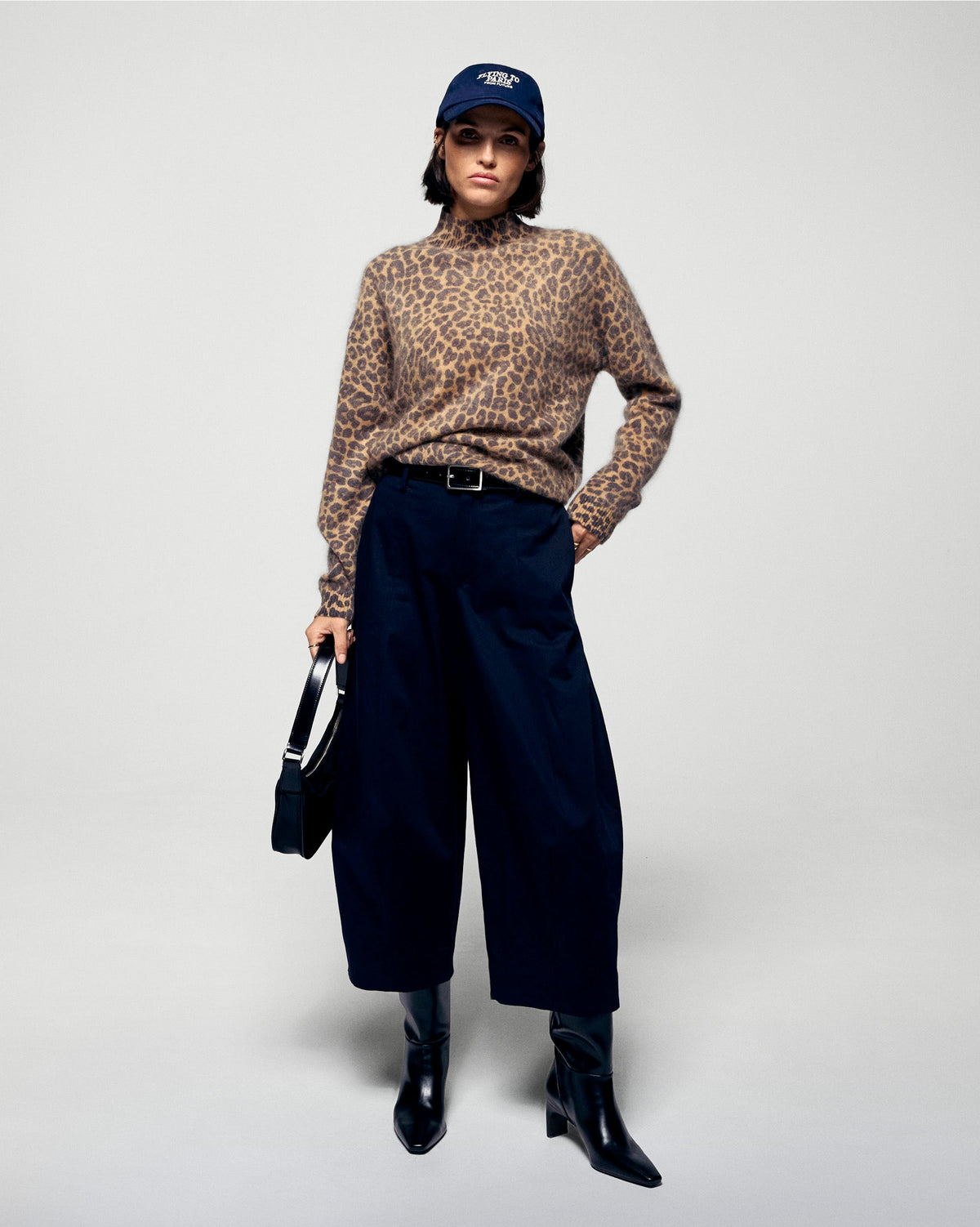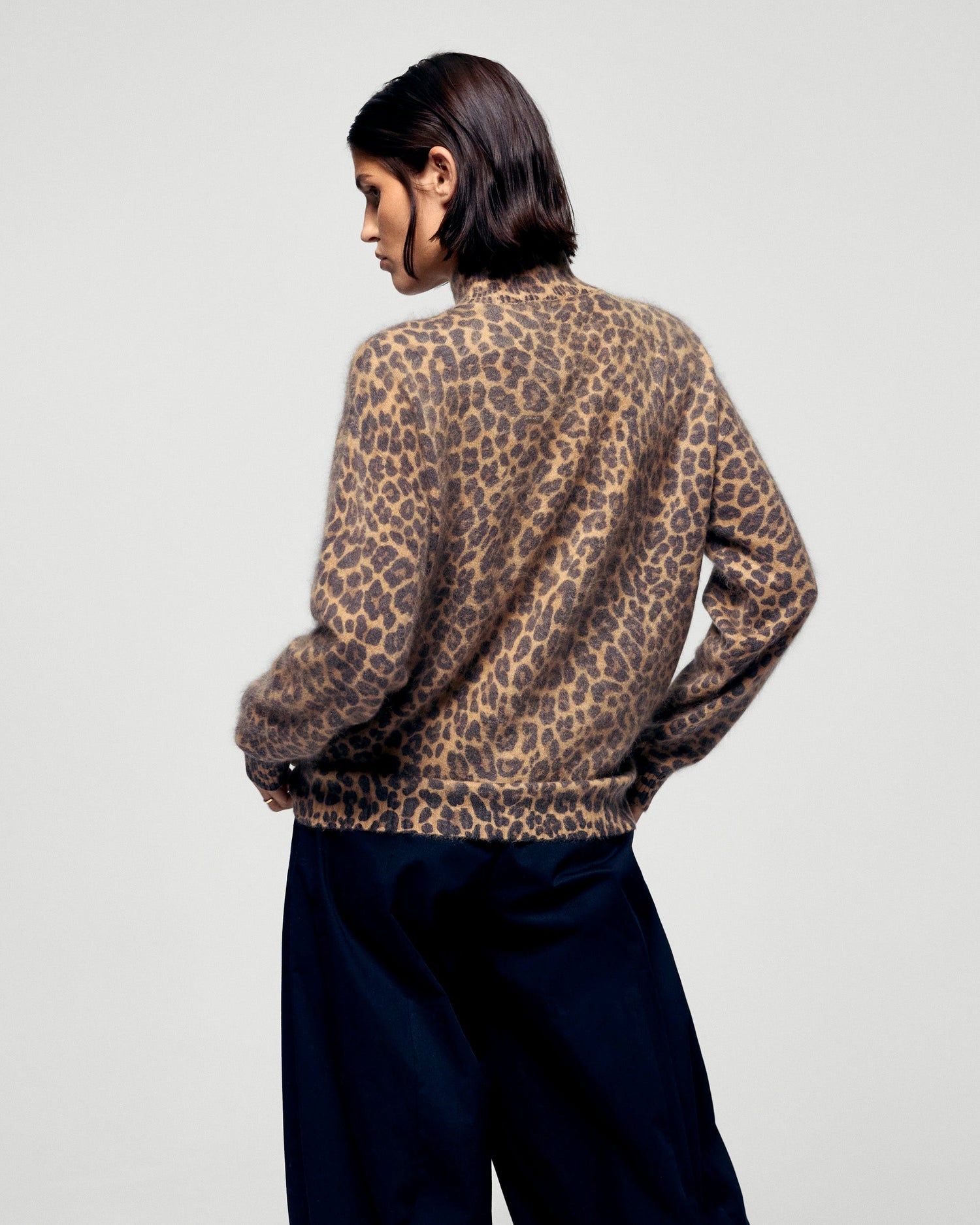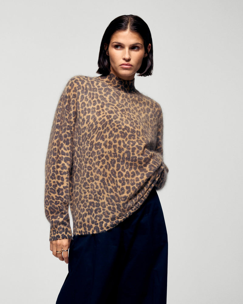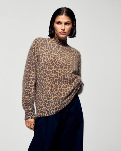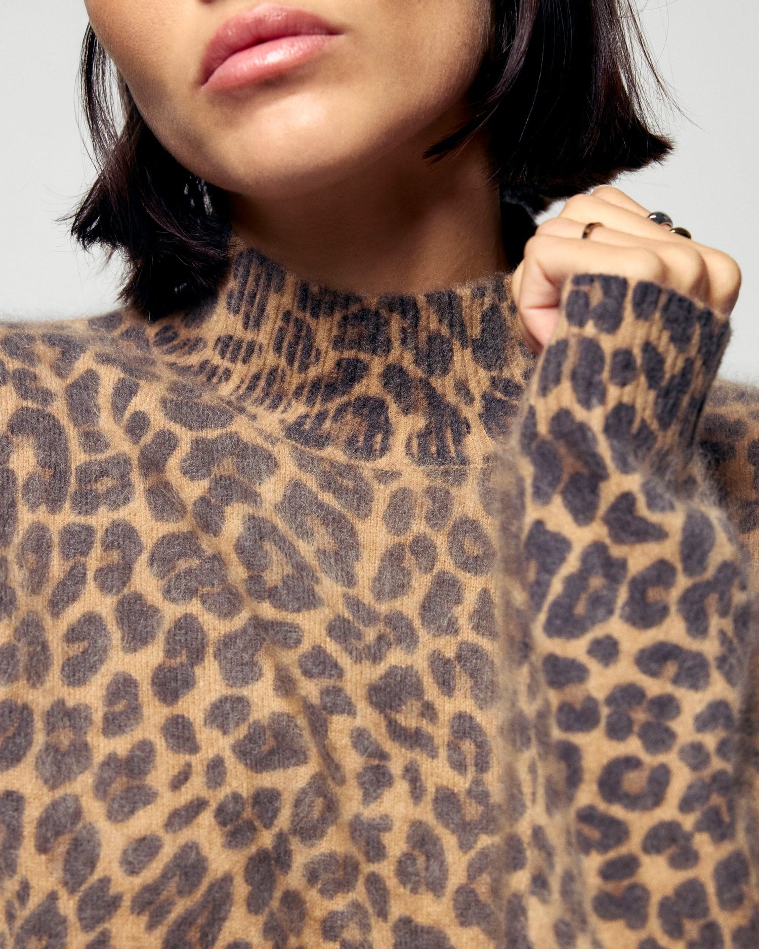 Brushed Cashmere Mock Neck Leopard Print Sweater