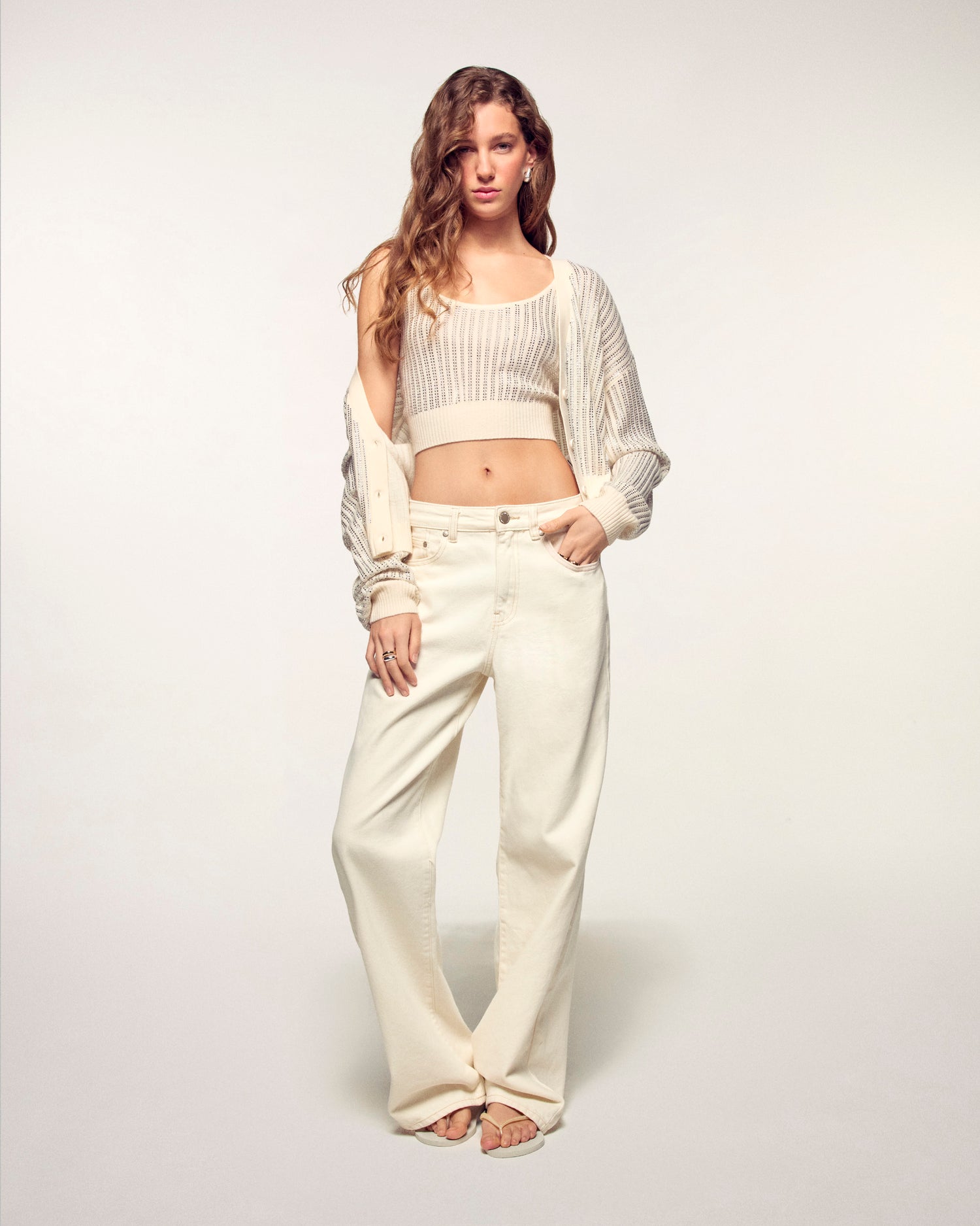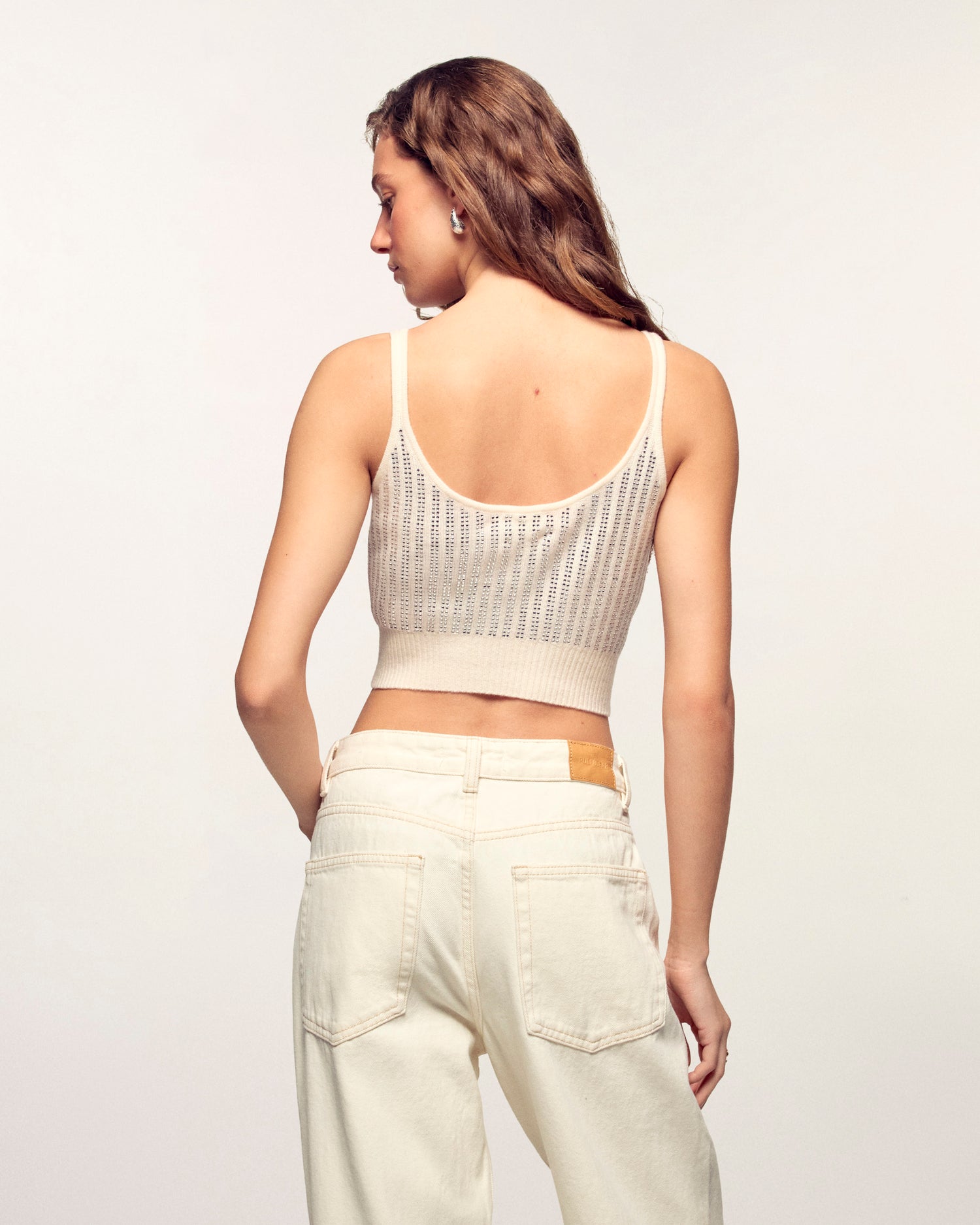 A minimalist and luminous piece that adds a touch of sparkle to your summer wardrobe. This bralette top stands out with delicately scattered silver hotfix rhinestones, creating a look that is both relaxed and sophisticated.