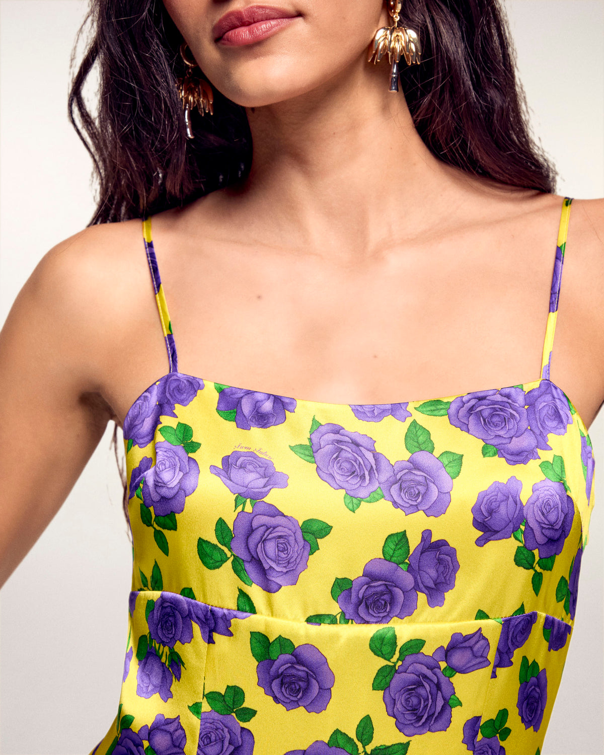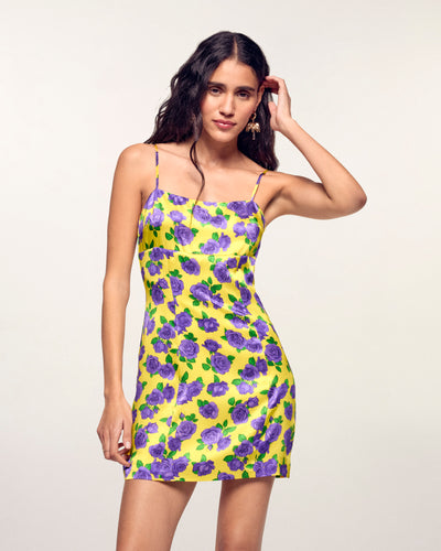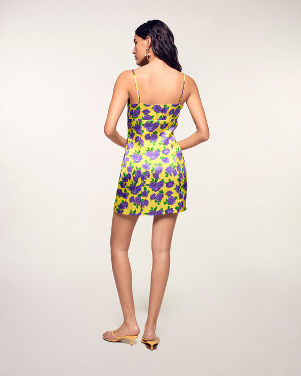 This silk satin short dress features a vibrant floral print for an irresistible sun-kissed look. Its fluid cut and delicate details make it the perfect piece for your summer days, combining comfort and natural elegance.