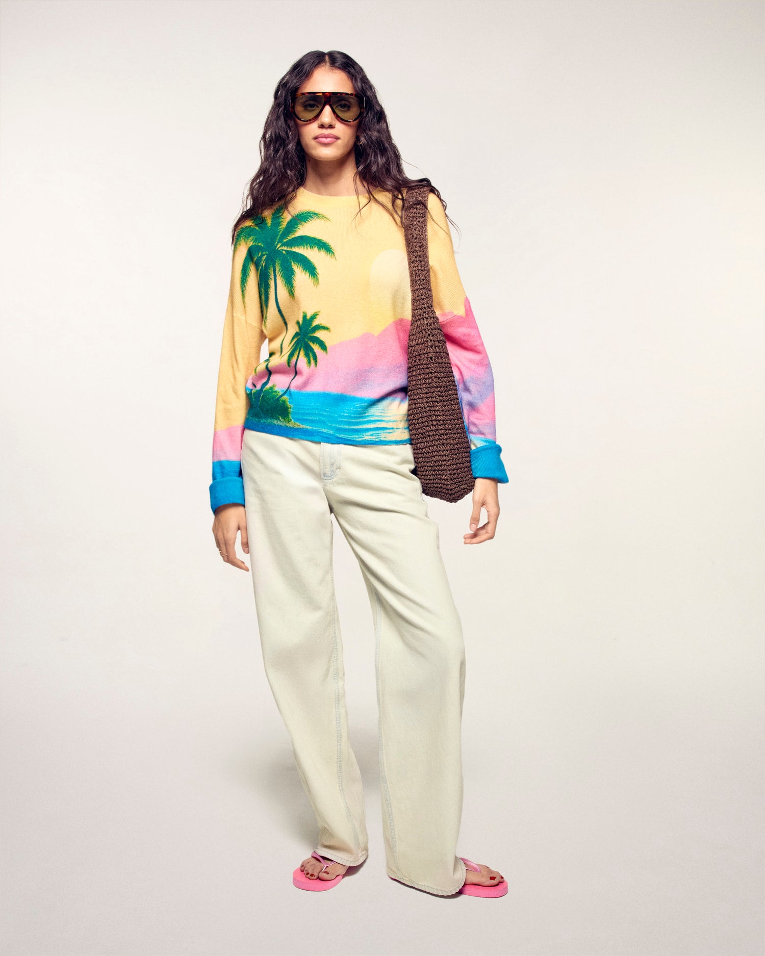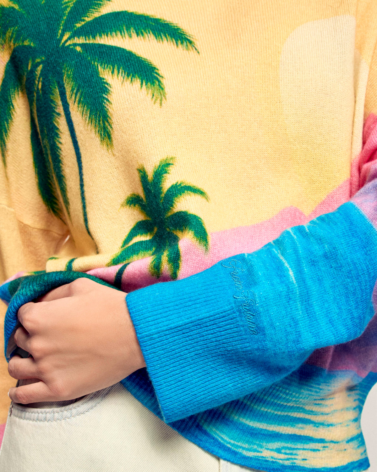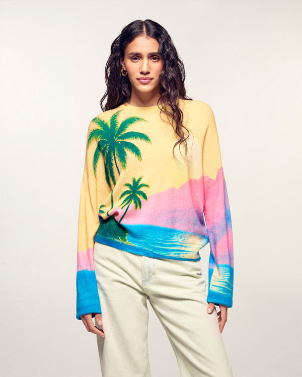 The sweater that transports you directly to the tropics. Crafted from 2-ply Cashmere, this crewneck sweater offers a soft and light knit. Its oversize fit is highlighted by a vibrant all-over print representing a sunset and palm trees.
