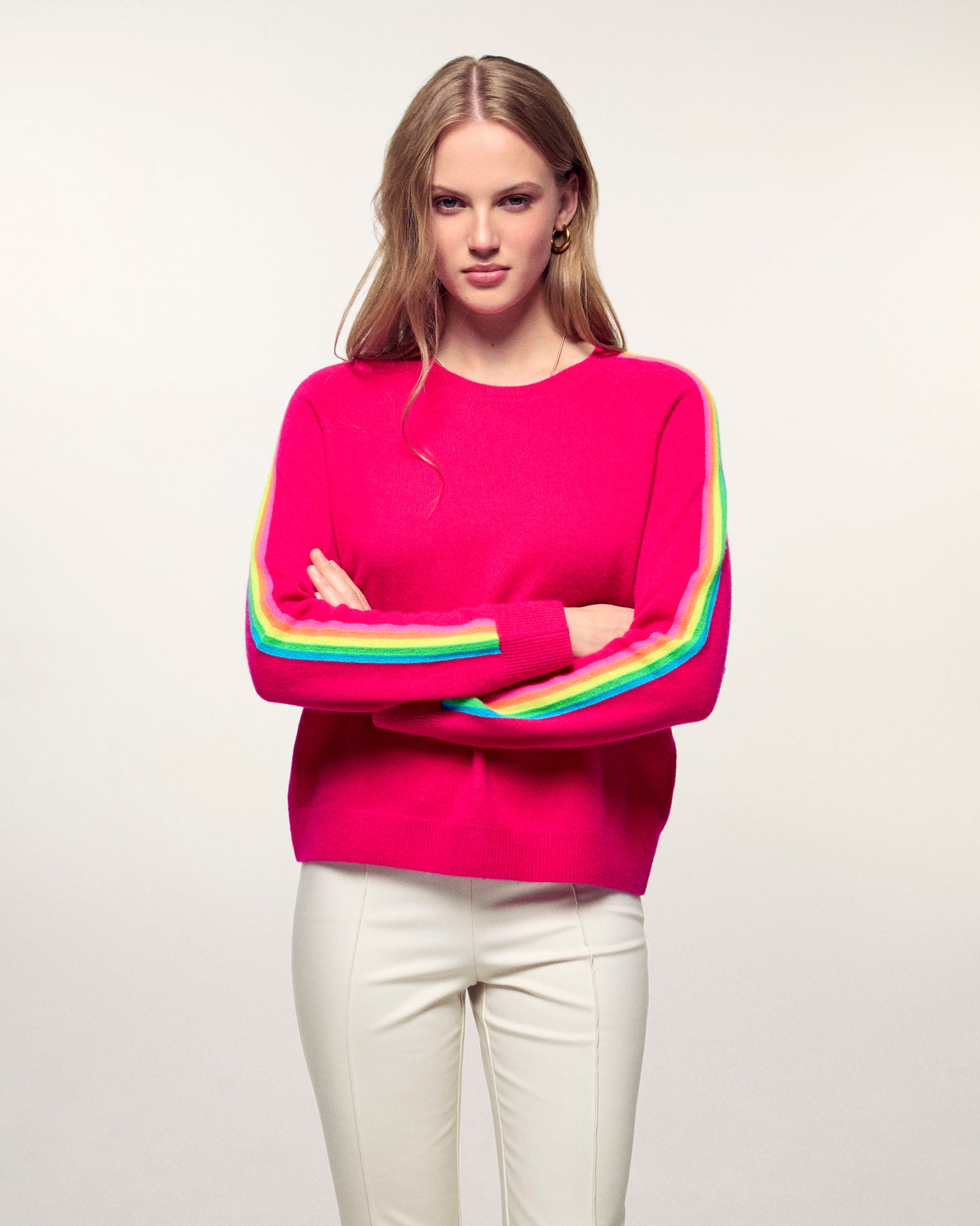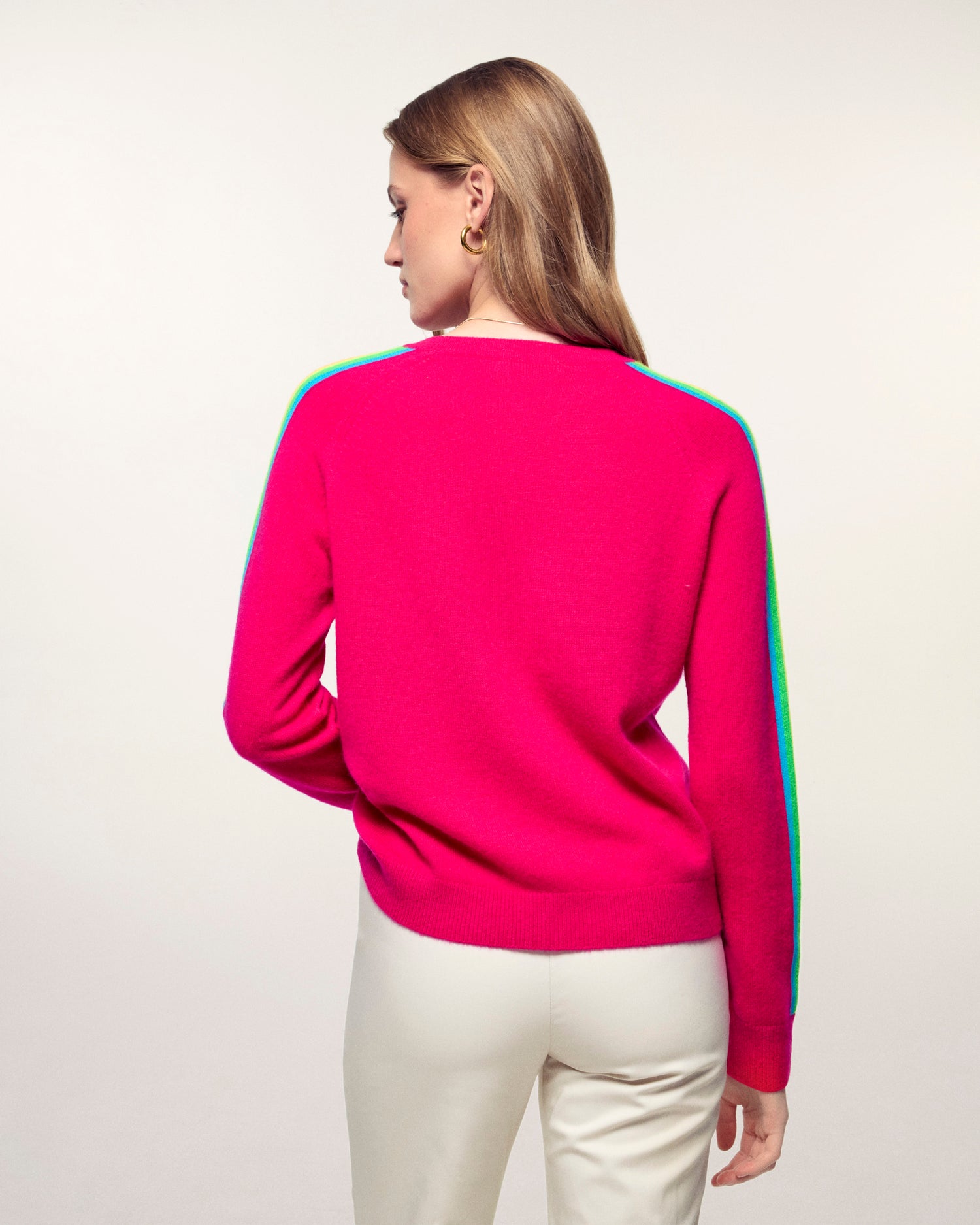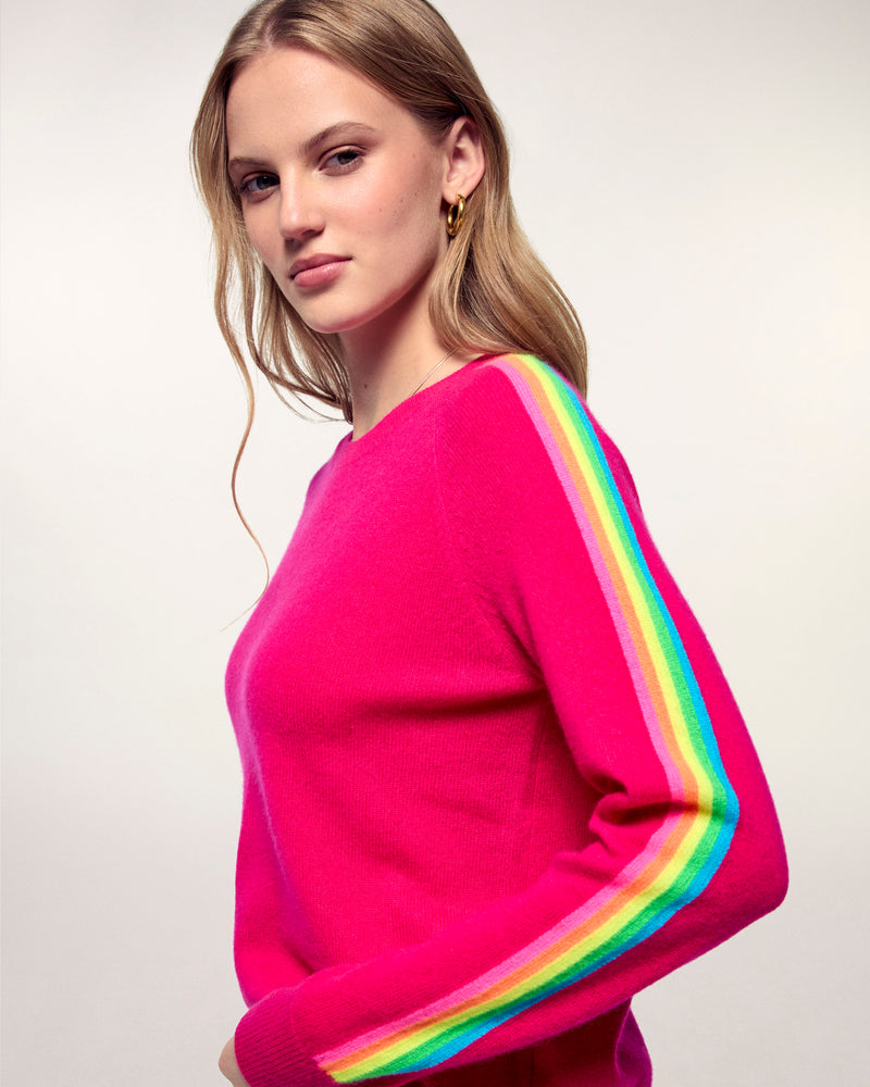 The elegance of cashmere meets bold colors with this crewneck sweater. Crafted from 2-ply cashmere, it offers incomparable softness and ideal lightness. Its multicolored stripes on the sleeves, a true signature, energize its regular fit for a look that is both modern and timeless.