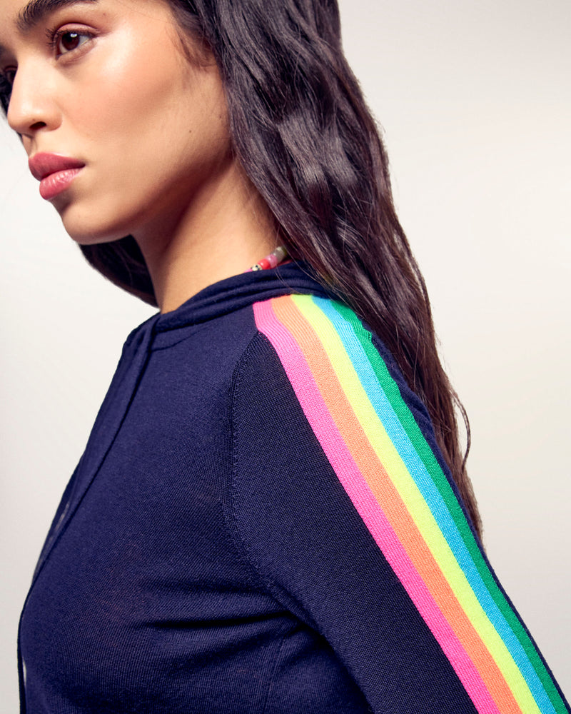 This cropped hoodie sweater reveals multicolored stripes along the sleeves, adding a signature From Future touch. Crafted from 2-ply merino wool, it features a drawstring hood, zip closure, and ribbed edges. Complete your look with casual jeans or straight-leg pants.