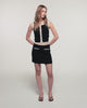 A graphic and sophisticated piece that plays with contrasts to structure the silhouette. This top stands out with its contrasting tubular trims and its front opening adorned with decorative rhinestone buttons, creating a look that is both modern and refined.